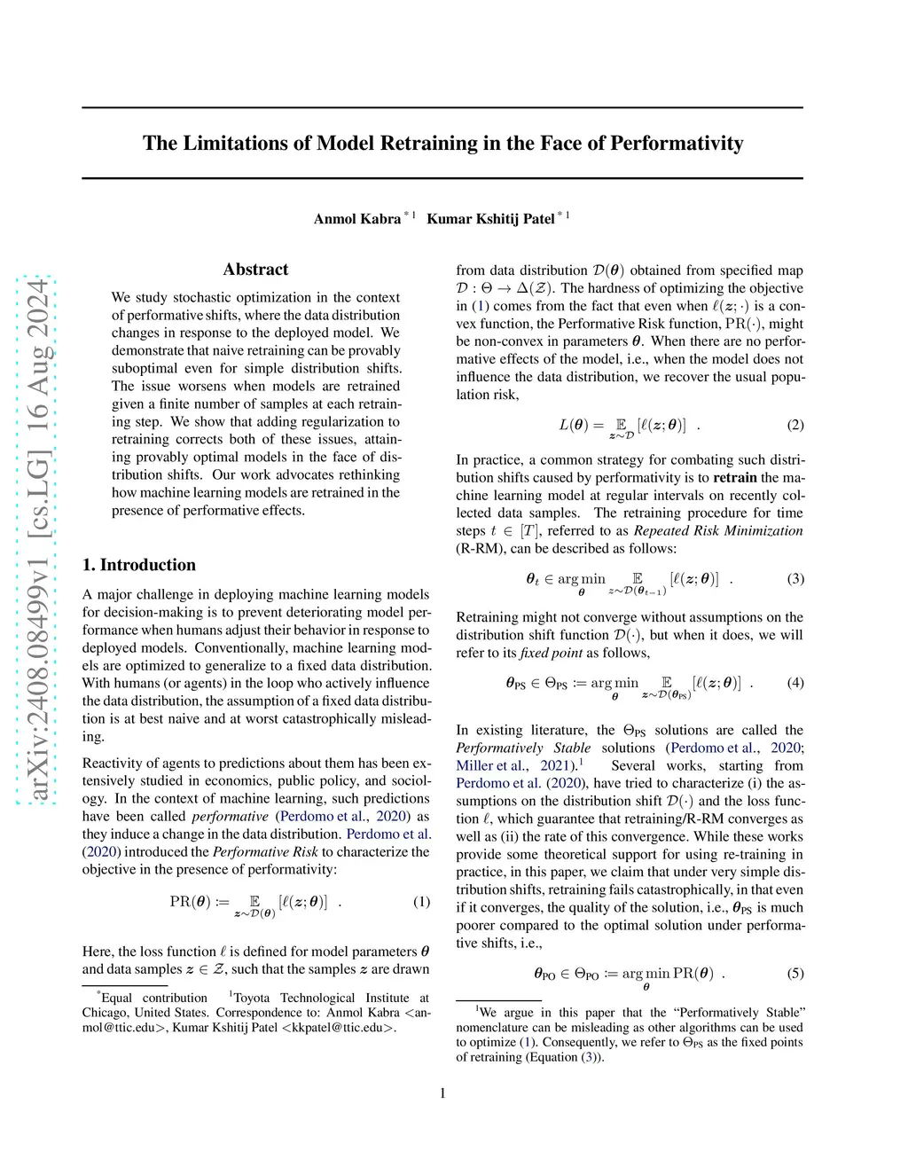 We study stochastic optimization in the context of performative shifts, where the data distribution changes in response to the deployed model. We demonstrate that naive retraining can be provably suboptimal even for simple distribution shifts. The issue worsens when models are retrained given a finite number of samples at each retraining step. We show that adding regularization to retraining corrects both of these issues, attaining provably optimal models in the face of distribution shifts. Our work advocates rethinking how machine learning models are retrained in the presence of performative effects.