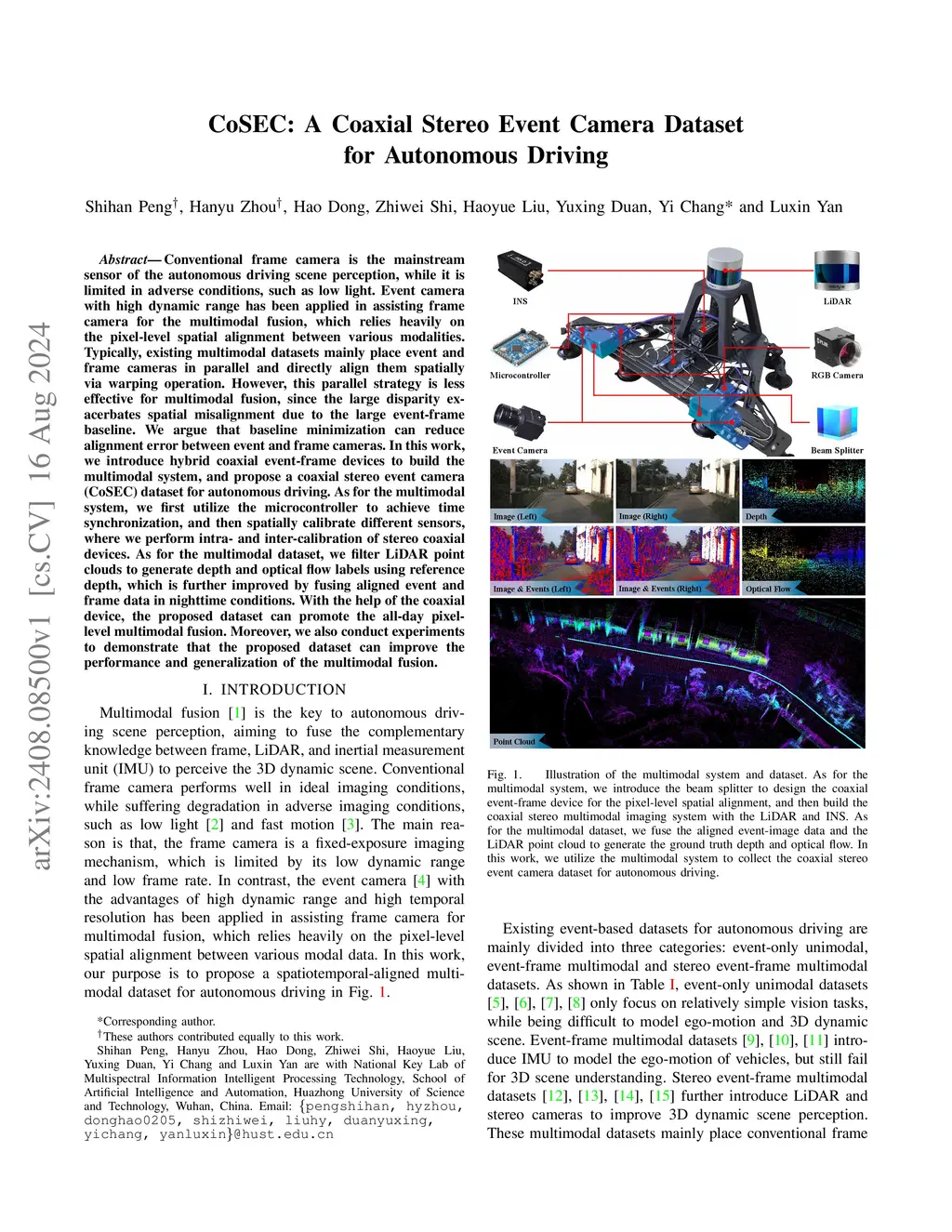 Conventional frame camera is the mainstream sensor of the autonomous driving scene perception, while it is limited in adverse conditions, such as low light. Event camera with high dynamic range has been applied in assisting frame camera for the multimodal fusion, which relies heavily on the pixel-level spatial alignment between various modalities. Typically, existing multimodal datasets mainly place event and frame cameras in parallel and directly align them spatially via warping operation. However, this parallel strategy is less effective for multimodal fusion, since the large disparity exacerbates spatial misalignment due to the large event-frame baseline. We argue that baseline minimization can reduce alignment error between event and frame cameras. In this work, we introduce hybrid coaxial event-frame devices to build the multimodal system, and propose a coaxial stereo event camera (CoSEC) dataset for autonomous driving. As for the multimodal system, we first utilize the microcontroller to achieve time synchronization, and then spatially calibrate different sensors, where we perform intra- and inter-calibration of stereo coaxial devices. As for the multimodal dataset, we filter LiDAR point clouds to generate depth and optical flow labels using reference depth, which is further improved by fusing aligned event and frame data in nighttime conditions. With the help of the coaxial device, the proposed dataset can promote the all-day pixel-level multimodal fusion. Moreover, we also conduct experiments to demonstrate that the proposed dataset can improve the performance and generalization of the multimodal fusion.