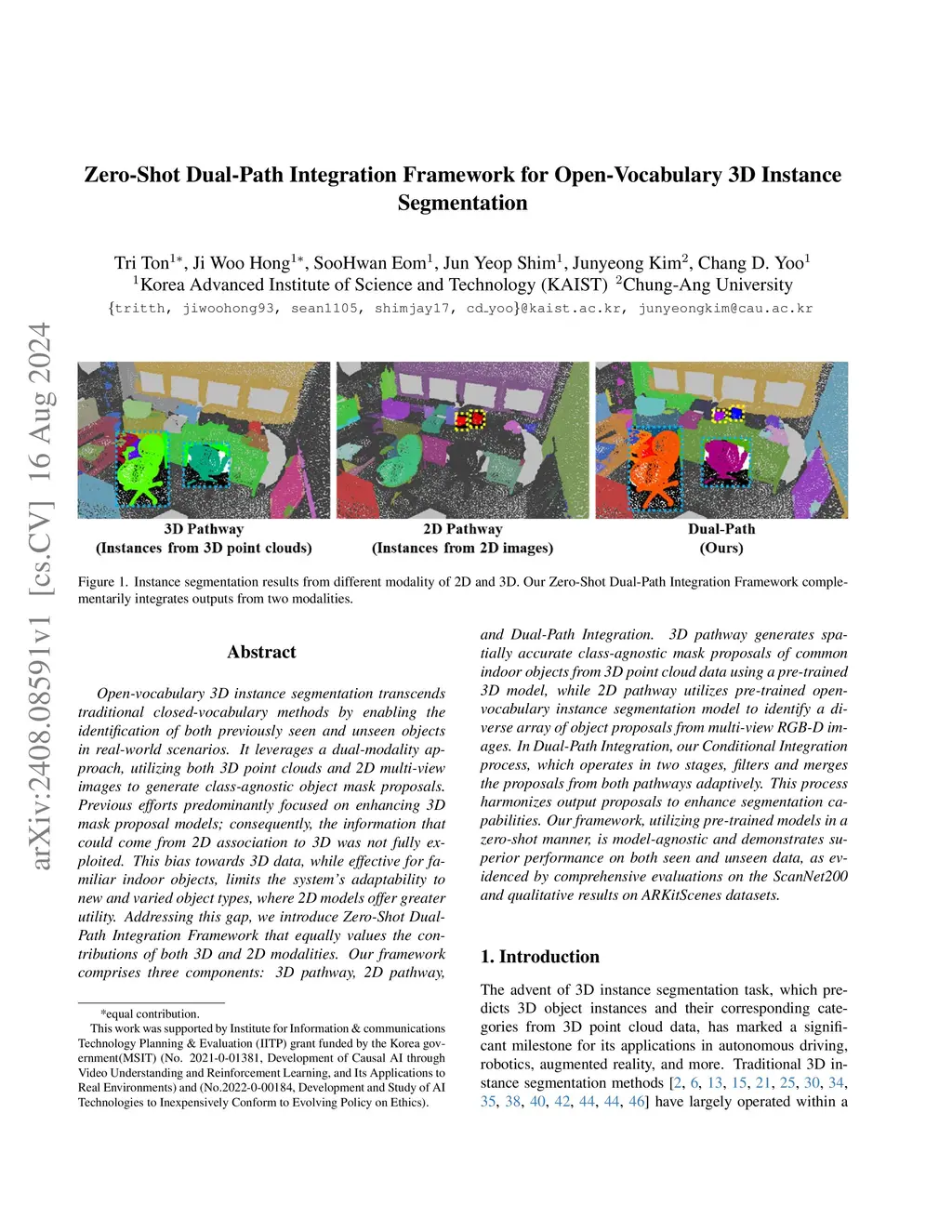 Open-vocabulary 3D instance segmentation transcends traditional closed-vocabulary methods by enabling the identification of both previously seen and unseen objects in real-world scenarios. It leverages a dual-modality approach, utilizing both 3D point clouds and 2D multi-view images to generate class-agnostic object mask proposals. Previous efforts predominantly focused on enhancing 3D mask proposal models; consequently, the information that could come from 2D association to 3D was not fully exploited. This bias towards 3D data, while effective for familiar indoor objects, limits the system's adaptability to new and varied object types, where 2D models offer greater utility. Addressing this gap, we introduce Zero-Shot Dual-Path Integration Framework that equally values the contributions of both 3D and 2D modalities. Our framework comprises three components: 3D pathway, 2D pathway, and Dual-Path Integration. 3D pathway generates spatially accurate class-agnostic mask proposals of common indoor objects from 3D point cloud data using a pre-trained 3D model, while 2D pathway utilizes pre-trained open-vocabulary instance segmentation model to identify a diverse array of object proposals from multi-view RGB-D images. In Dual-Path Integration, our Conditional Integration process, which operates in two stages, filters and merges the proposals from both pathways adaptively. This process harmonizes output proposals to enhance segmentation capabilities. Our framework, utilizing pre-trained models in a zero-shot manner, is model-agnostic and demonstrates superior performance on both seen and unseen data, as evidenced by comprehensive evaluations on the ScanNet200 and qualitative results on ARKitScenes datasets.