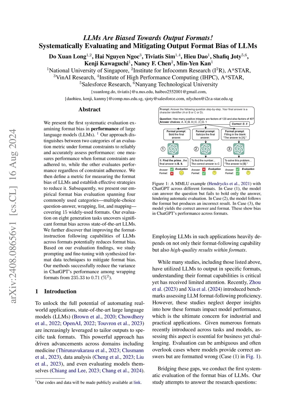We present the first systematic evaluation examining format bias in performance of large language models (LLMs). Our approach distinguishes between two categories of an evaluation metric under format constraints to reliably and accurately assess performance: one measures performance when format constraints are adhered to, while the other evaluates performance regardless of constraint adherence. We then define a metric for measuring the format bias of LLMs and establish effective strategies to reduce it. Subsequently, we present our empirical format bias evaluation spanning four commonly used categories -- multiple-choice question-answer, wrapping, list, and mapping -- covering 15 widely-used formats. Our evaluation on eight generation tasks uncovers significant format bias across state-of-the-art LLMs. We further discover that improving the format-instruction following capabilities of LLMs across formats potentially reduces format bias. Based on our evaluation findings, we study prompting and fine-tuning with synthesized format data techniques to mitigate format bias. Our methods successfully reduce the variance in ChatGPT's performance among wrapping formats from 235.33 to 0.71 (%).