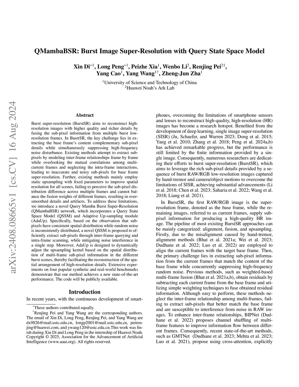Burst super-resolution aims to reconstruct high-resolution images with higher quality and richer details by fusing the sub-pixel information from multiple burst low-resolution frames. In BusrtSR, the key challenge lies in extracting the base frame's content complementary sub-pixel details while simultaneously suppressing high-frequency noise disturbance. Existing methods attempt to extract sub-pixels by modeling inter-frame relationships frame by frame while overlooking the mutual correlations among multi-current frames and neglecting the intra-frame interactions, leading to inaccurate and noisy sub-pixels for base frame super-resolution. Further, existing methods mainly employ static upsampling with fixed parameters to improve spatial resolution for all scenes, failing to perceive the sub-pixel distribution difference across multiple frames and cannot balance the fusion weights of different frames, resulting in over-smoothed details and artifacts. To address these limitations, we introduce a novel Query Mamba Burst Super-Resolution (QMambaBSR) network, which incorporates a Query State Space Model (QSSM) and Adaptive Up-sampling module (AdaUp). Specifically, based on the observation that sub-pixels have consistent spatial distribution while random noise is inconsistently distributed, a novel QSSM is proposed to efficiently extract sub-pixels through inter-frame querying and intra-frame scanning while mitigating noise interference in a single step. Moreover, AdaUp is designed to dynamically adjust the upsampling kernel based on the spatial distribution of multi-frame sub-pixel information in the different burst scenes, thereby facilitating the reconstruction of the spatial arrangement of high-resolution details. Extensive experiments on four popular synthetic and real-world benchmarks demonstrate that our method achieves a new state-of-the-art performance.