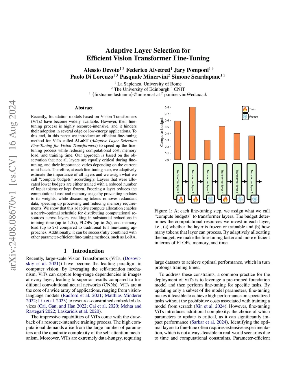 Recently, foundation models based on Vision Transformers (ViTs) have become widely available. However, their fine-tuning process is highly resource-intensive, and it hinders their adoption in several edge or low-energy applications. To this end, in this paper we introduce an efficient fine-tuning method for ViTs called () to speed up the fine-tuning process while reducing computational cost, memory load, and training time. Our approach is based on the observation that not all layers are equally critical during fine-tuning, and their importance varies depending on the current mini-batch. Therefore, at each fine-tuning step, we adaptively estimate the importance of all layers and we assign what we call ``compute budgets'' accordingly. Layers that were allocated lower budgets are either trained with a reduced number of input tokens or kept frozen. Freezing a layer reduces the computational cost and memory usage by preventing updates to its weights, while discarding tokens removes redundant data, speeding up processing and reducing memory requirements. We show that this adaptive compute allocation enables a nearly-optimal schedule for distributing computational resources across layers, resulting in substantial reductions in training time (up to 1.5x), FLOPs (up to 2x), and memory load (up to 2x) compared to traditional full fine-tuning approaches. Additionally, it can be successfully combined with other parameter-efficient fine-tuning methods, such as LoRA.