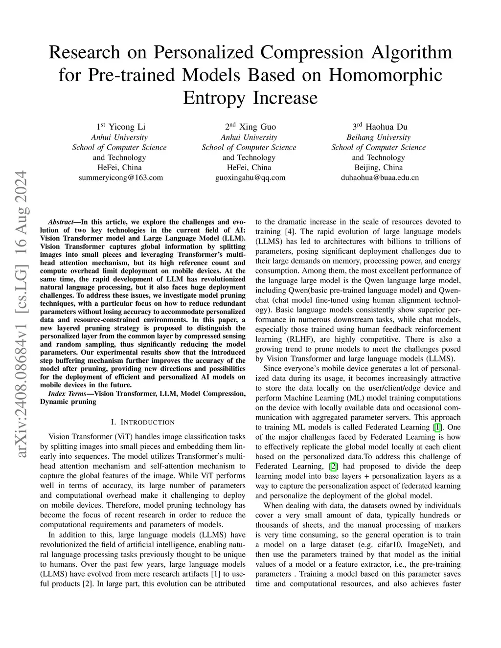 In this article, we explore the challenges and evolution of two key technologies in the current field of AI: Vision Transformer model and Large Language Model (LLM). Vision Transformer captures global information by splitting images into small pieces and leveraging Transformer's multi-head attention mechanism, but its high reference count and compute overhead limit deployment on mobile devices. At the same time, the rapid development of LLM has revolutionized natural language processing, but it also faces huge deployment challenges. To address these issues, we investigate model pruning techniques, with a particular focus on how to reduce redundant parameters without losing accuracy to accommodate personalized data and resource-constrained environments. In this paper, a new layered pruning strategy is proposed to distinguish the personalized layer from the common layer by compressed sensing and random sampling, thus significantly reducing the model parameters. Our experimental results show that the introduced step buffering mechanism further improves the accuracy of the model after pruning, providing new directions and possibilities for the deployment of efficient and personalized AI models on mobile devices in the future.