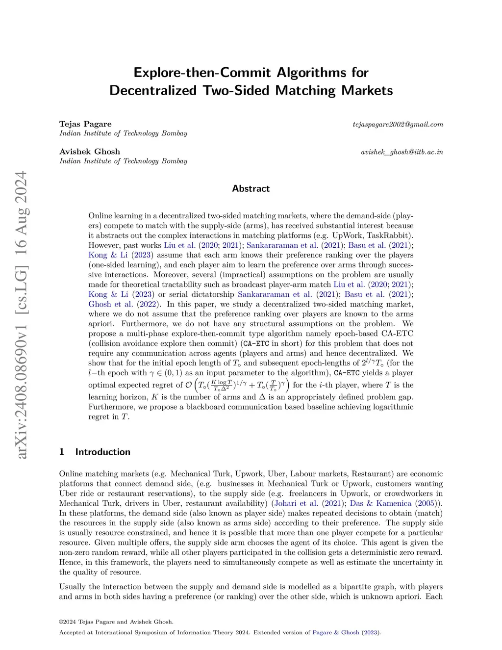 Online learning in a decentralized two-sided matching markets, where the demand-side (players) compete to match with the supply-side (arms), has received substantial interest because it abstracts out the complex interactions in matching platforms (e.g. UpWork, TaskRabbit). However, past works assume that each arm knows their preference ranking over the players (one-sided learning), and each player aim to learn the preference over arms through successive interactions. Moreover, several (impractical) assumptions on the problem are usually made for theoretical tractability such as broadcast player-arm match Liu et al. (2020; 2021); Kong & Li (2023) or serial dictatorship Sankararaman et al. (2021); Basu et al. (2021); Ghosh et al. (2022). In this paper, we study a decentralized two-sided matching market, where we do not assume that the preference ranking over players are known to the arms apriori. Furthermore, we do not have any structural assumptions on the problem. We propose a multi-phase explore-then-commit type algorithm namely epoch-based CA-ETC (collision avoidance explore then commit) (\texttt{CA-ETC} in short) for this problem that does not require any communication across agents (players and arms) and hence decentralized. We show that for the initial epoch length of and subsequent epoch-lengths of (for the th epoch with as an input parameter to the algorithm), \texttt{CA-ETC} yields a player optimal expected regret of for the -th player, where is the learning horizon, is the number of arms and is an appropriately defined problem gap. Furthermore, we propose a blackboard communication based baseline achieving logarithmic regret in .
