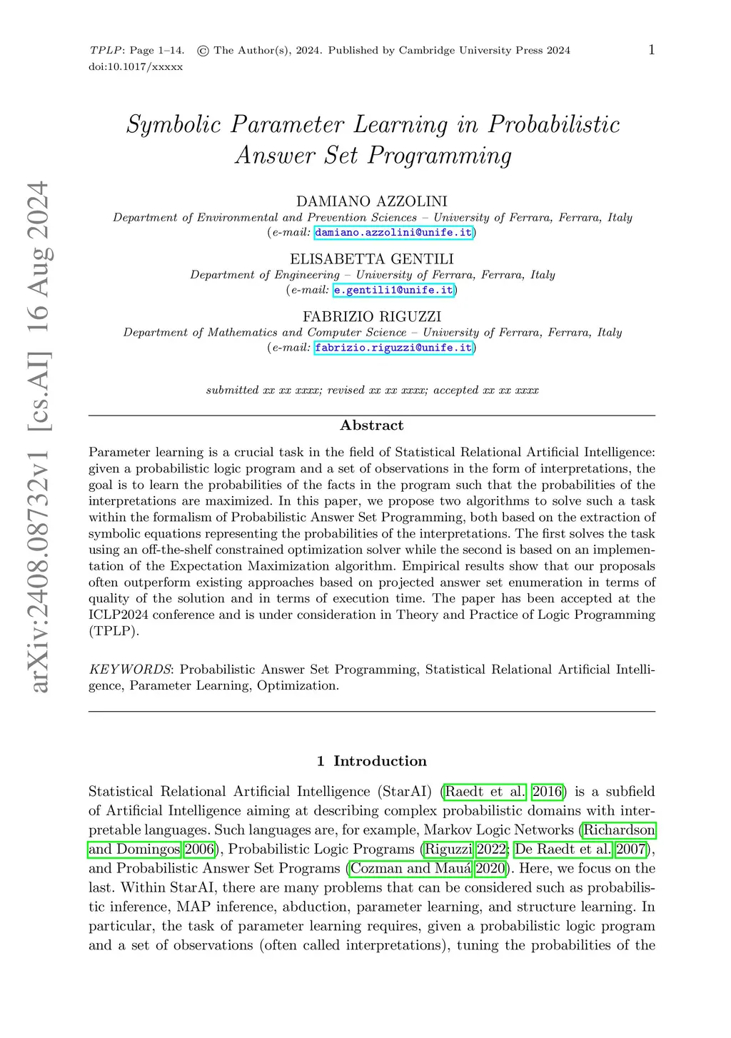 Symbolic Parameter Learning in Probabilistic Answer Set Programming