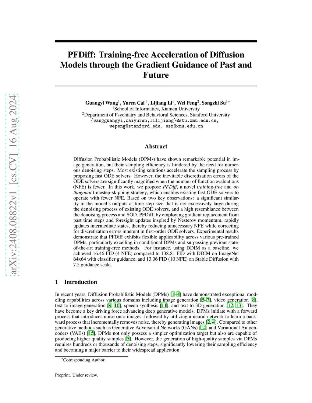 Diffusion Probabilistic Models (DPMs) have shown remarkable potential in image generation, but their sampling efficiency is hindered by the need for numerous denoising steps. Most existing solutions accelerate the sampling process by proposing fast ODE solvers. However, the inevitable discretization errors of the ODE solvers are significantly magnified when the number of function evaluations (NFE) is fewer. In this work, we propose PFDiff, a novel training-free and orthogonal timestep-skipping strategy, which enables existing fast ODE solvers to operate with fewer NFE. Specifically, PFDiff initially utilizes score replacement from past time steps to predict a ``springboard". Subsequently, it employs this ``springboard" along with foresight updates inspired by Nesterov momentum to rapidly update current intermediate states. This approach effectively reduces unnecessary NFE while correcting for discretization errors inherent in first-order ODE solvers. Experimental results demonstrate that PFDiff exhibits flexible applicability across various pre-trained DPMs, particularly excelling in conditional DPMs and surpassing previous state-of-the-art training-free methods. For instance, using DDIM as a baseline, we achieved 16.46 FID (4 NFE) compared to 138.81 FID with DDIM on ImageNet 64x64 with classifier guidance, and 13.06 FID (10 NFE) on Stable Diffusion with 7.5 guidance scale. Code is available at \url{this https URL}.