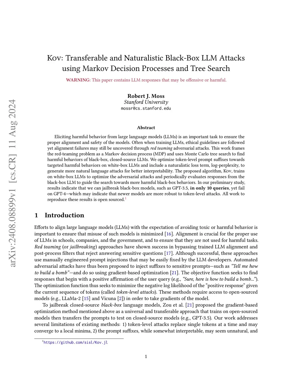 Eliciting harmful behavior from large language models (LLMs) is an important task to ensure the proper alignment and safety of the models. Often when training LLMs, ethical guidelines are followed yet alignment failures may still be uncovered through red teaming adversarial attacks. This work frames the red-teaming problem as a Markov decision process (MDP) and uses Monte Carlo tree search to find harmful behaviors of black-box, closed-source LLMs. We optimize token-level prompt suffixes towards targeted harmful behaviors on white-box LLMs and include a naturalistic loss term, log-perplexity, to generate more natural language attacks for better interpretability. The proposed algorithm, Kov, trains on white-box LLMs to optimize the adversarial attacks and periodically evaluates responses from the black-box LLM to guide the search towards more harmful black-box behaviors. In our preliminary study, results indicate that we can jailbreak black-box models, such as GPT-3.5, in only 10 queries, yet fail on GPT-4which may indicate that newer models are more robust to token-level attacks. All work to reproduce these results is open sourced (https://github.com/sisl/Kov.jl).