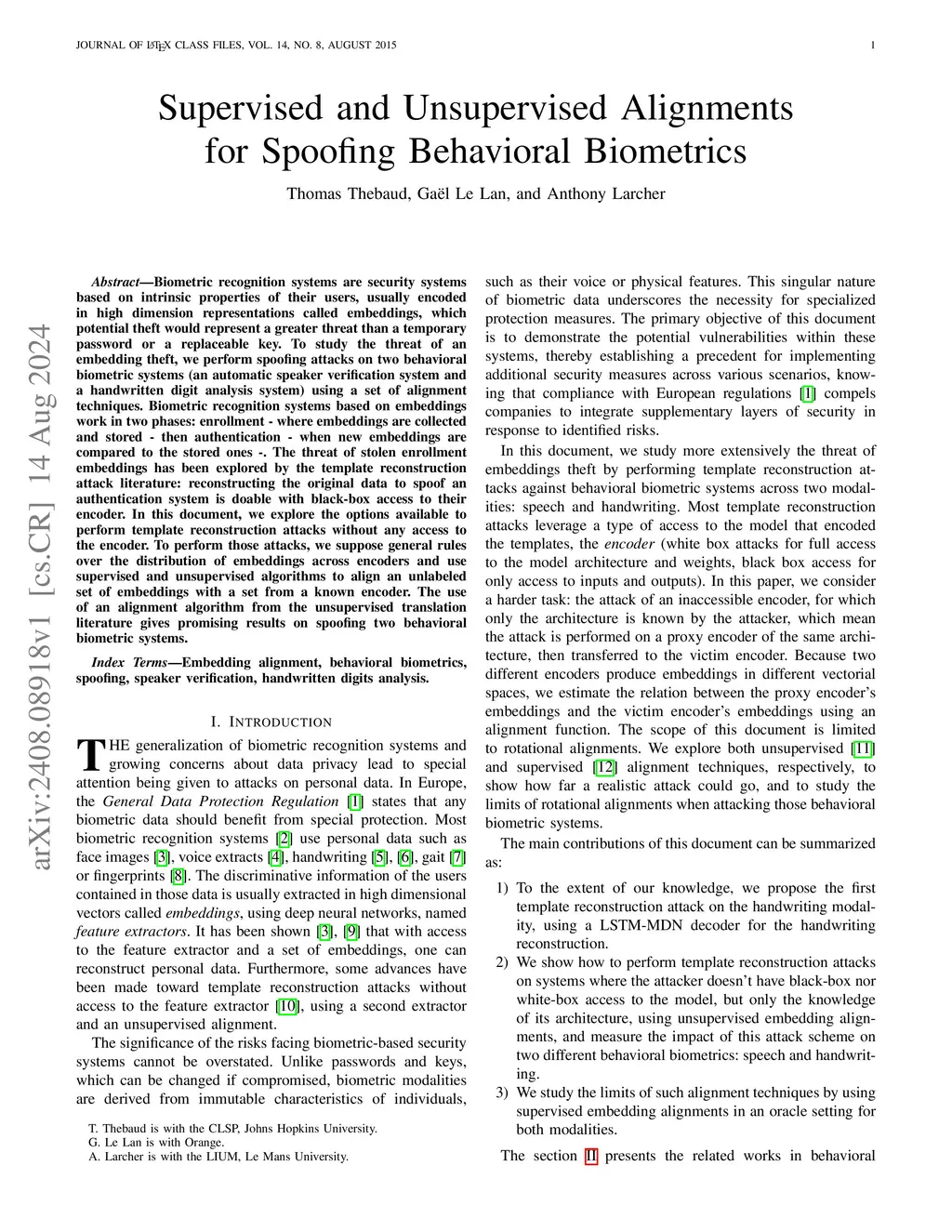 Biometric recognition systems are security systems based on intrinsic properties of their users, usually encoded in high dimension representations called embeddings, which potential theft would represent a greater threat than a temporary password or a replaceable key. To study the threat of embedding theft, we perform spoofing attacks on two behavioral biometric systems (an automatic speaker verification system and a handwritten digit analysis system) using a set of alignment techniques. Biometric recognition systems based on embeddings work in two phases: enrollment - where embeddings are collected and stored - then authentication - when new embeddings are compared to the stored ones -.The threat of stolen enrollment embeddings has been explored by the template reconstruction attack literature: reconstructing the original data to spoof an authentication system is doable with black-box access to their encoder. In this document, we explore the options available to perform template reconstruction attacks without any access to the encoder. To perform those attacks, we suppose general rules over the distribution of embeddings across encoders and use supervised and unsupervised algorithms to align an unlabeled set of embeddings with a set from a known encoder. The use of an alignment algorithm from the unsupervised translation literature gives promising results on spoofing two behavioral biometric systems.