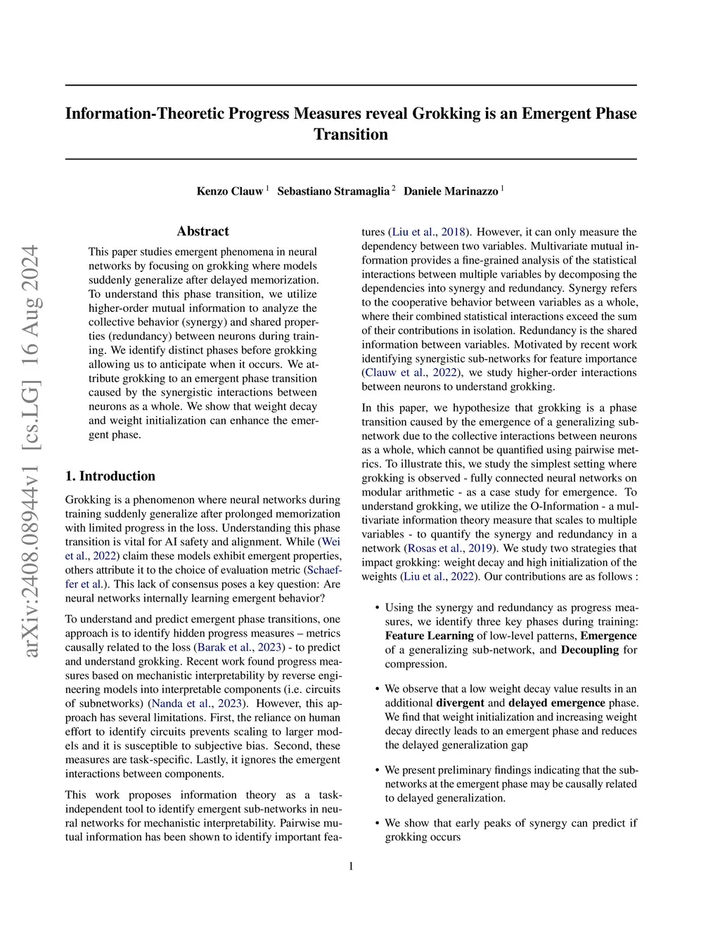 This paper studies emergent phenomena in neural networks by focusing on grokking where models suddenly generalize after delayed memorization. To understand this phase transition, we utilize higher-order mutual information to analyze the collective behavior (synergy) and shared properties (redundancy) between neurons during training. We identify distinct phases before grokking allowing us to anticipate when it occurs. We attribute grokking to an emergent phase transition caused by the synergistic interactions between neurons as a whole. We show that weight decay and weight initialization can enhance the emergent phase.