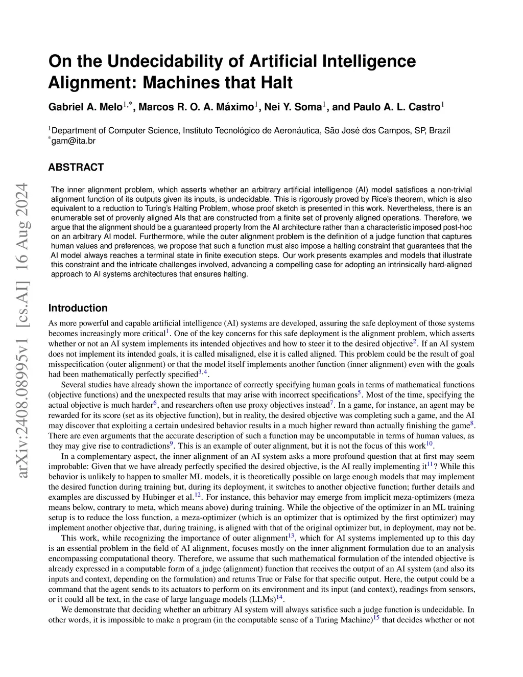 The inner alignment problem, which asserts whether an arbitrary artificial intelligence (AI) model satisfices a non-trivial alignment function of its outputs given its inputs, is undecidable. This is rigorously proved by Rice's theorem, which is also equivalent to a reduction to Turing's Halting Problem, whose proof sketch is presented in this work. Nevertheless, there is an enumerable set of provenly aligned AIs that are constructed from a finite set of provenly aligned operations. Therefore, we argue that the alignment should be a guaranteed property from the AI architecture rather than a characteristic imposed post-hoc on an arbitrary AI model. Furthermore, while the outer alignment problem is the definition of a judge function that captures human values and preferences, we propose that such a function must also impose a halting constraint that guarantees that the AI model always reaches a terminal state in finite execution steps. Our work presents examples and models that illustrate this constraint and the intricate challenges involved, advancing a compelling case for adopting an intrinsically hard-aligned approach to AI systems architectures that ensures halting.
