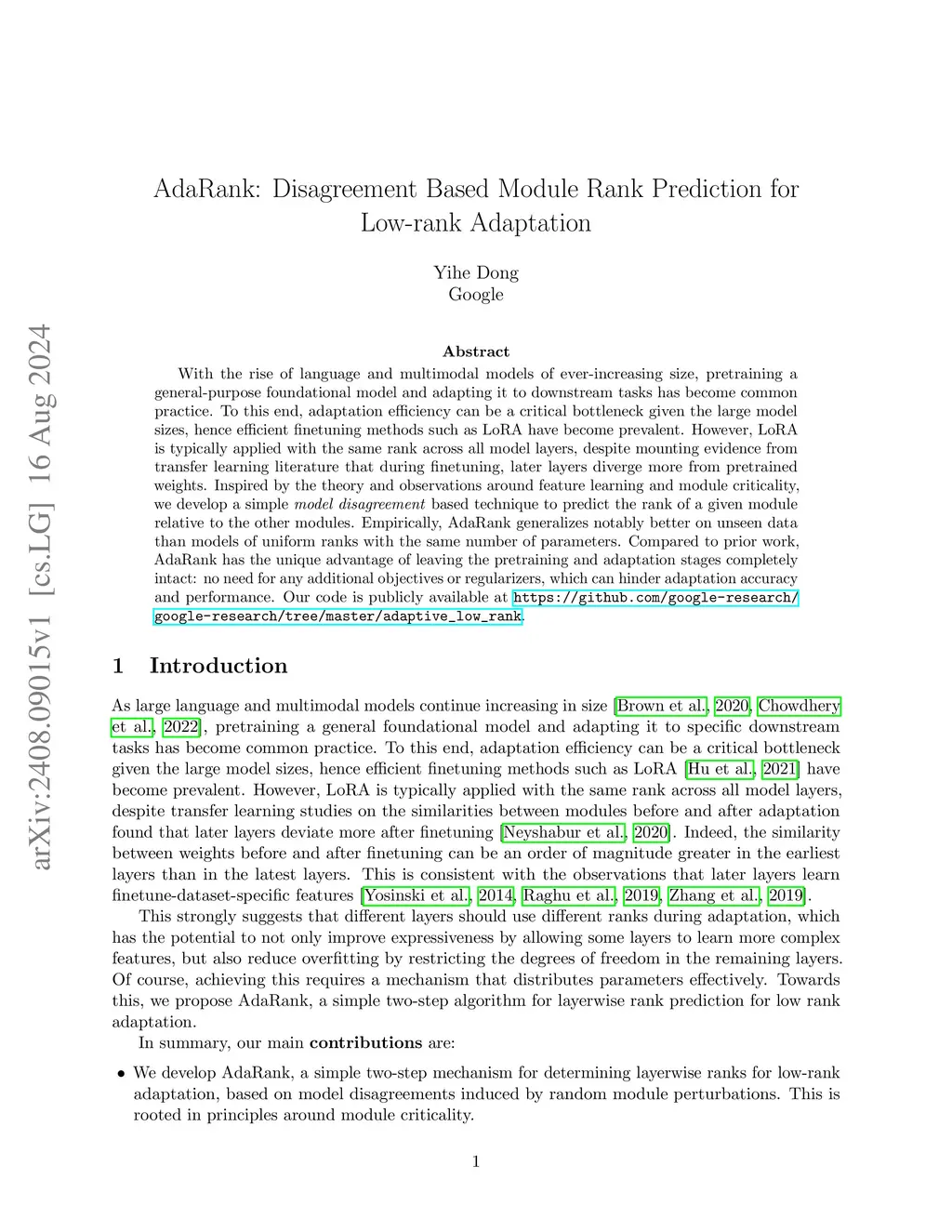With the rise of language and multimodal models of ever-increasing size, pretraining a general-purpose foundational model and adapting it to downstream tasks has become common practice. To this end, adaptation efficiency can be a critical bottleneck given the large model sizes, hence efficient finetuning methods such as LoRA have become prevalent. However, LoRA is typically applied with the same rank across all model layers, despite mounting evidence from transfer learning literature that during finetuning, later layers diverge more from pretrained weights. Inspired by the theory and observations around feature learning and module criticality, we develop a simple model disagreement based technique to predict the rank of a given module relative to the other modules. Empirically, AdaRank generalizes notably better on unseen data than using uniform ranks with the same number of parameters. Compared to prior work, AdaRank has the unique advantage of leaving the pretraining and adaptation stages completely intact: no need for any additional objectives or regularizers, which can hinder adaptation accuracy and performance. Our code is publicly available at https://github.com/google-research/google-research/tree/master/adaptive_low_rank.