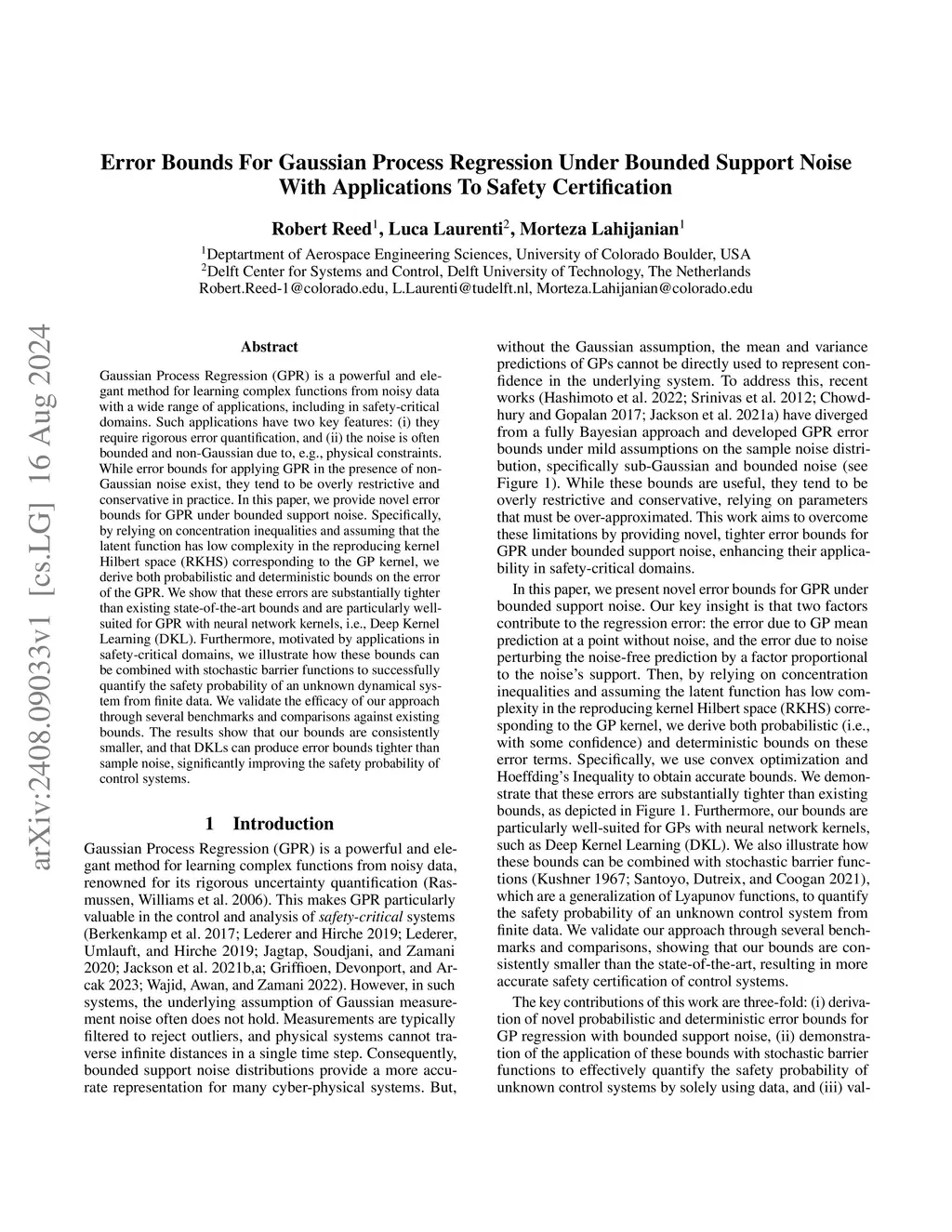 Gaussian Process Regression (GPR) is a powerful and elegant method for learning complex functions from noisy data with a wide range of applications, including in safety-critical domains. Such applications have two key features: (i) they require rigorous error quantification, and (ii) the noise is often bounded and non-Gaussian due to, e.g., physical constraints. While error bounds for applying GPR in the presence of non-Gaussian noise exist, they tend to be overly restrictive and conservative in practice. In this paper, we provide novel error bounds for GPR under bounded support noise. Specifically, by relying on concentration inequalities and assuming that the latent function has low complexity in the reproducing kernel Hilbert space (RKHS) corresponding to the GP kernel, we derive both probabilistic and deterministic bounds on the error of the GPR. We show that these errors are substantially tighter than existing state-of-the-art bounds and are particularly well-suited for GPR with neural network kernels, i.e., Deep Kernel Learning (DKL). Furthermore, motivated by applications in safety-critical domains, we illustrate how these bounds can be combined with stochastic barrier functions to successfully quantify the safety probability of an unknown dynamical system from finite data. We validate the efficacy of our approach through several benchmarks and comparisons against existing bounds. The results show that our bounds are consistently smaller, and that DKLs can produce error bounds tighter than sample noise, significantly improving the safety probability of control systems.