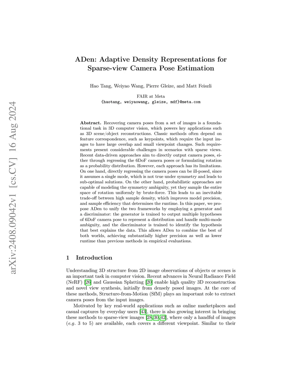 Recovering camera poses from a set of images is a foundational task in 3D computer vision, which powers key applications such as 3D scene/object reconstructions. Classic methods often depend on feature correspondence, such as keypoints, which require the input images to have large overlap and small viewpoint changes. Such requirements present considerable challenges in scenarios with sparse views. Recent data-driven approaches aim to directly output camera poses, either through regressing the 6DoF camera poses or formulating rotation as a probability distribution. However, each approach has its limitations. On one hand, directly regressing the camera poses can be ill-posed, since it assumes a single mode, which is not true under symmetry and leads to sub-optimal solutions. On the other hand, probabilistic approaches are capable of modeling the symmetry ambiguity, yet they sample the entire space of rotation uniformly by brute-force. This leads to an inevitable trade-off between high sample density, which improves model precision, and sample efficiency that determines the runtime. In this paper, we propose ADen to unify the two frameworks by employing a generator and a discriminator: the generator is trained to output multiple hypotheses of 6DoF camera pose to represent a distribution and handle multi-mode ambiguity, and the discriminator is trained to identify the hypothesis that best explains the data. This allows ADen to combine the best of both worlds, achieving substantially higher precision as well as lower runtime than previous methods in empirical evaluations.