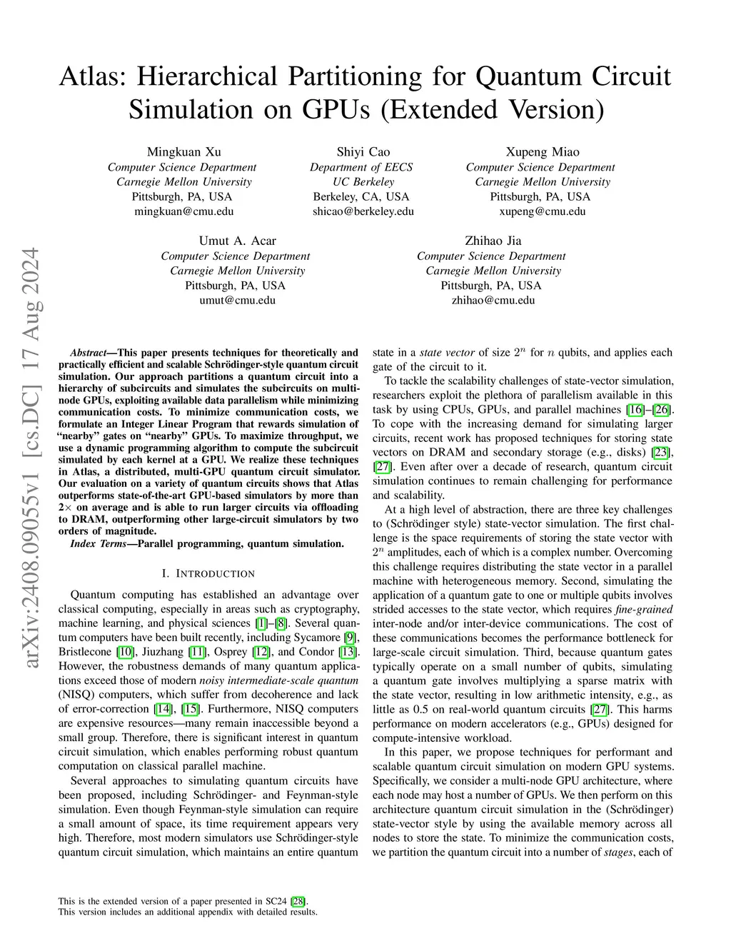 This paper presents techniques for theoretically and practically efficient and scalable Schr\"odinger-style quantum circuit simulation. Our approach partitions a quantum circuit into a hierarchy of subcircuits and simulates the subcircuits on multi-node GPUs, exploiting available data parallelism while minimizing communication costs. To minimize communication costs, we formulate an Integer Linear Program that rewards simulation of "nearby" gates on "nearby" GPUs. To maximize throughput, we use a dynamic programming algorithm to compute the subcircuit simulated by each kernel at a GPU. We realize these techniques in Atlas, a distributed, multi-GPU quantum circuit simulator. Our evaluation on a variety of quantum circuits shows that Atlas outperforms state-of-the-art GPU-based simulators by more than 2 on average and is able to run larger circuits via offloading to DRAM, outperforming other large-circuit simulators by two orders of magnitude.