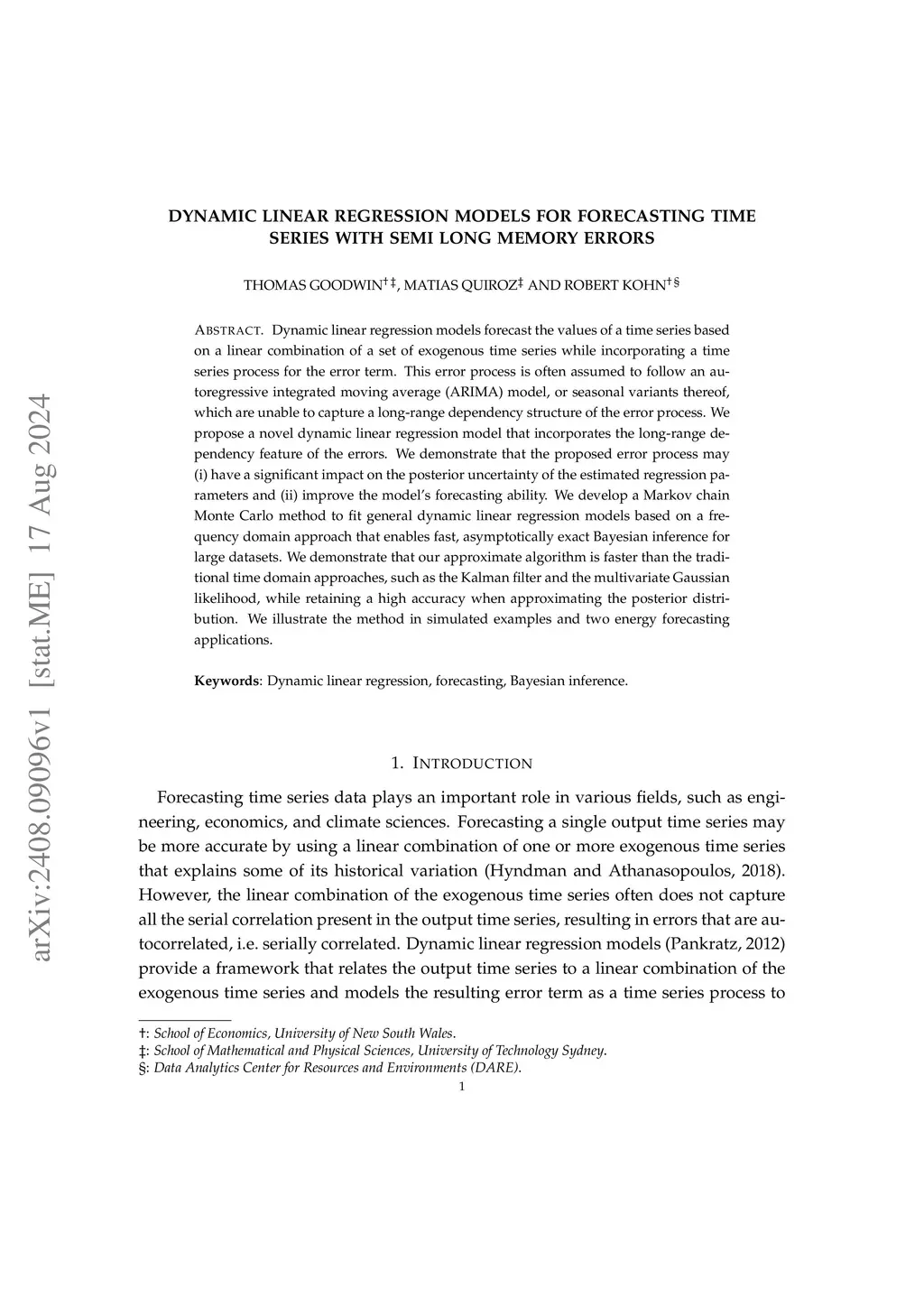 Dynamic linear regression models forecast the values of a time series based on a linear combination of a set of exogenous time series while incorporating a time series process for the error term. This error process is often assumed to follow an autoregressive integrated moving average (ARIMA) model, or seasonal variants thereof, which are unable to capture a long-range dependency structure of the error process. We propose a novel dynamic linear regression model that incorporates the long-range dependency feature of the errors. We demonstrate that the proposed error process may (i) have a significant impact on the posterior uncertainty of the estimated regression parameters and (ii) improve the model's forecasting ability. We develop a Markov chain Monte Carlo method to fit general dynamic linear regression models based on a frequency domain approach that enables fast, asymptotically exact Bayesian inference for large datasets. We demonstrate that our approximate algorithm is faster than the traditional time domain approaches, such as the Kalman filter and the multivariate Gaussian likelihood, while retaining a high accuracy when approximating the posterior distribution. We illustrate the method in simulated examples and two energy forecasting applications.