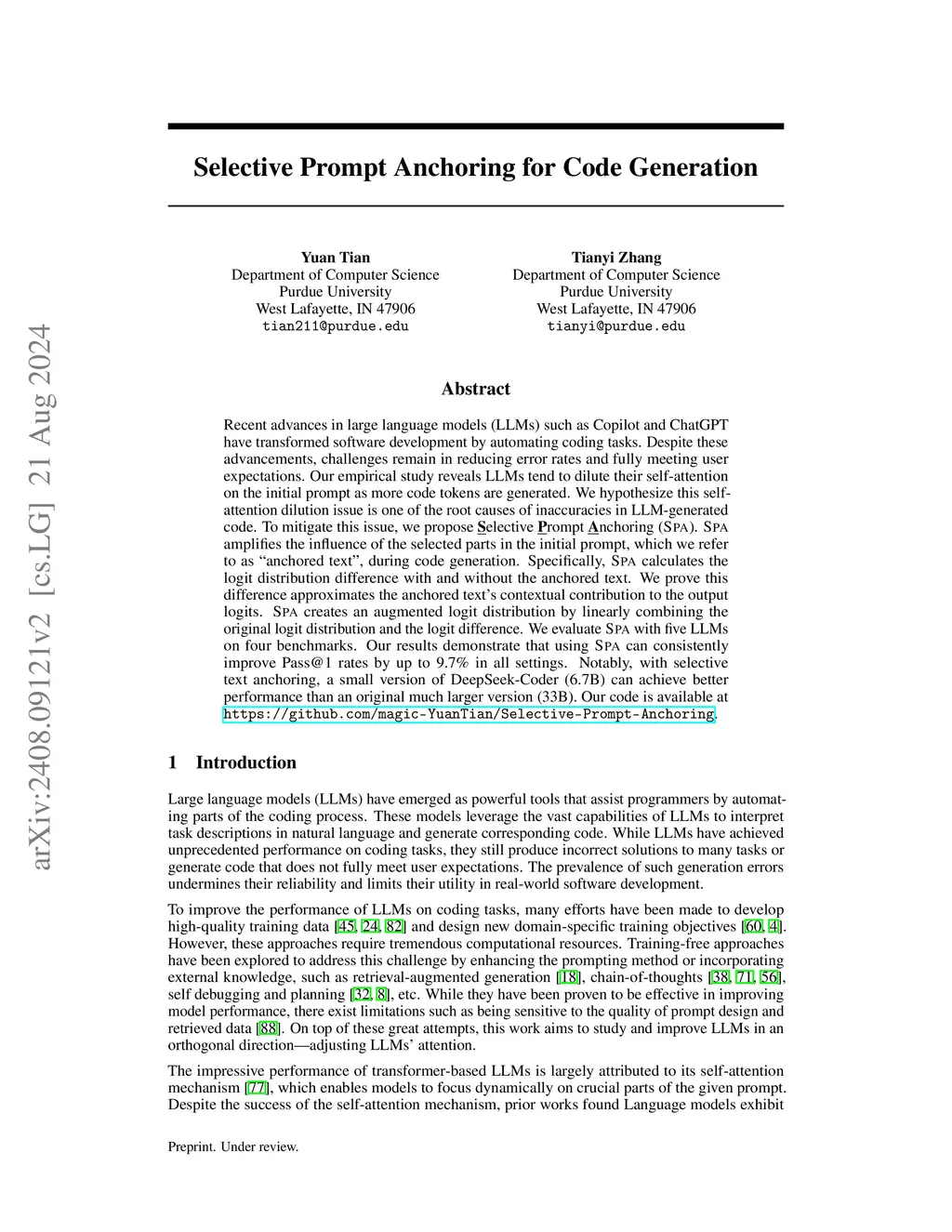 Selective Prompt Anchoring for Code Generation