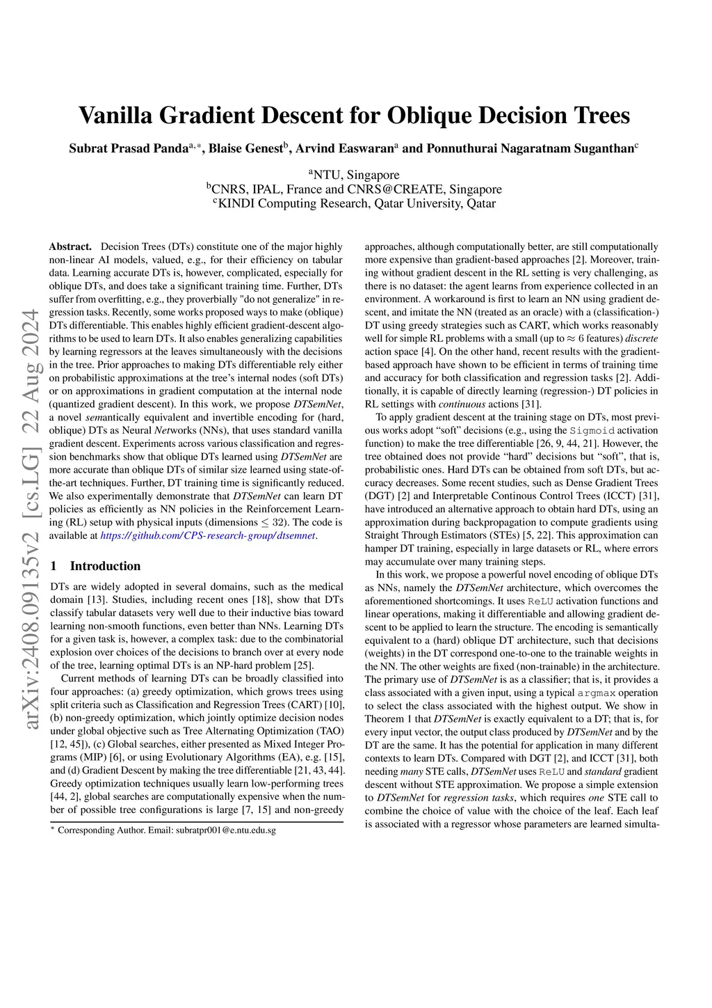 Decision Trees (DTs) constitute one of the major highly non-linear AI models, valued, e.g., for their efficiency on tabular data. Learning accurate DTs is, however, complicated, especially for oblique DTs, and does take a significant training time. Further, DTs suffer from overfitting, e.g., they proverbially "do not generalize" in regression tasks. Recently, some works proposed ways to make (oblique) DTs differentiable. This enables highly efficient gradient-descent algorithms to be used to learn DTs. It also enables generalizing capabilities by learning regressors at the leaves simultaneously with the decisions in the tree. Prior approaches to making DTs differentiable rely either on probabilistic approximations at the tree's internal nodes (soft DTs) or on approximations in gradient computation at the internal node (quantized gradient descent). In this work, we propose DTSemNet, a novel semantically equivalent and invertible encoding for (hard, oblique) DTs as Neural Networks (NNs), that uses standard vanilla gradient descent. Experiments across various classification and regression benchmarks show that oblique DTs learned using DTSemNet are more accurate than oblique DTs of similar size learned using state-of-the-art techniques. Further, DT training time is significantly reduced. We also experimentally demonstrate that DTSemNet can learn DT policies as efficiently as NN policies in the Reinforcement Learning (RL) setup with physical inputs (dimensions ). The code is available at {\color{blue}\textit{\url{https://github.com/CPS-research-group/dtsemnet}}}.