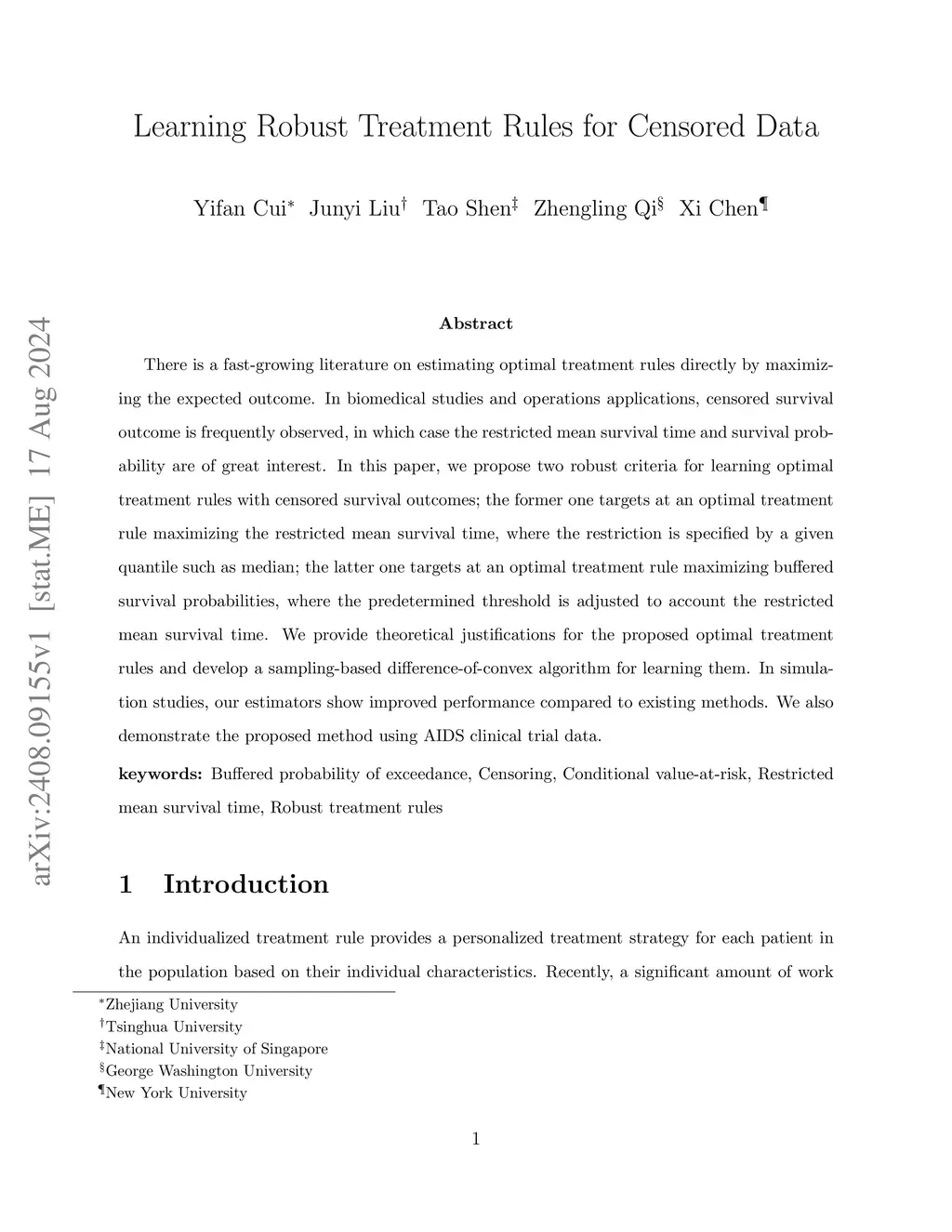 There is a fast-growing literature on estimating optimal treatment rules directly by maximizing the expected outcome. In biomedical studies and operations applications, censored survival outcome is frequently observed, in which case the restricted mean survival time and survival probability are of great interest. In this paper, we propose two robust criteria for learning optimal treatment rules with censored survival outcomes; the former one targets at an optimal treatment rule maximizing the restricted mean survival time, where the restriction is specified by a given quantile such as median; the latter one targets at an optimal treatment rule maximizing buffered survival probabilities, where the predetermined threshold is adjusted to account the restricted mean survival time. We provide theoretical justifications for the proposed optimal treatment rules and develop a sampling-based difference-of-convex algorithm for learning them. In simulation studies, our estimators show improved performance compared to existing methods. We also demonstrate the proposed method using AIDS clinical trial data.