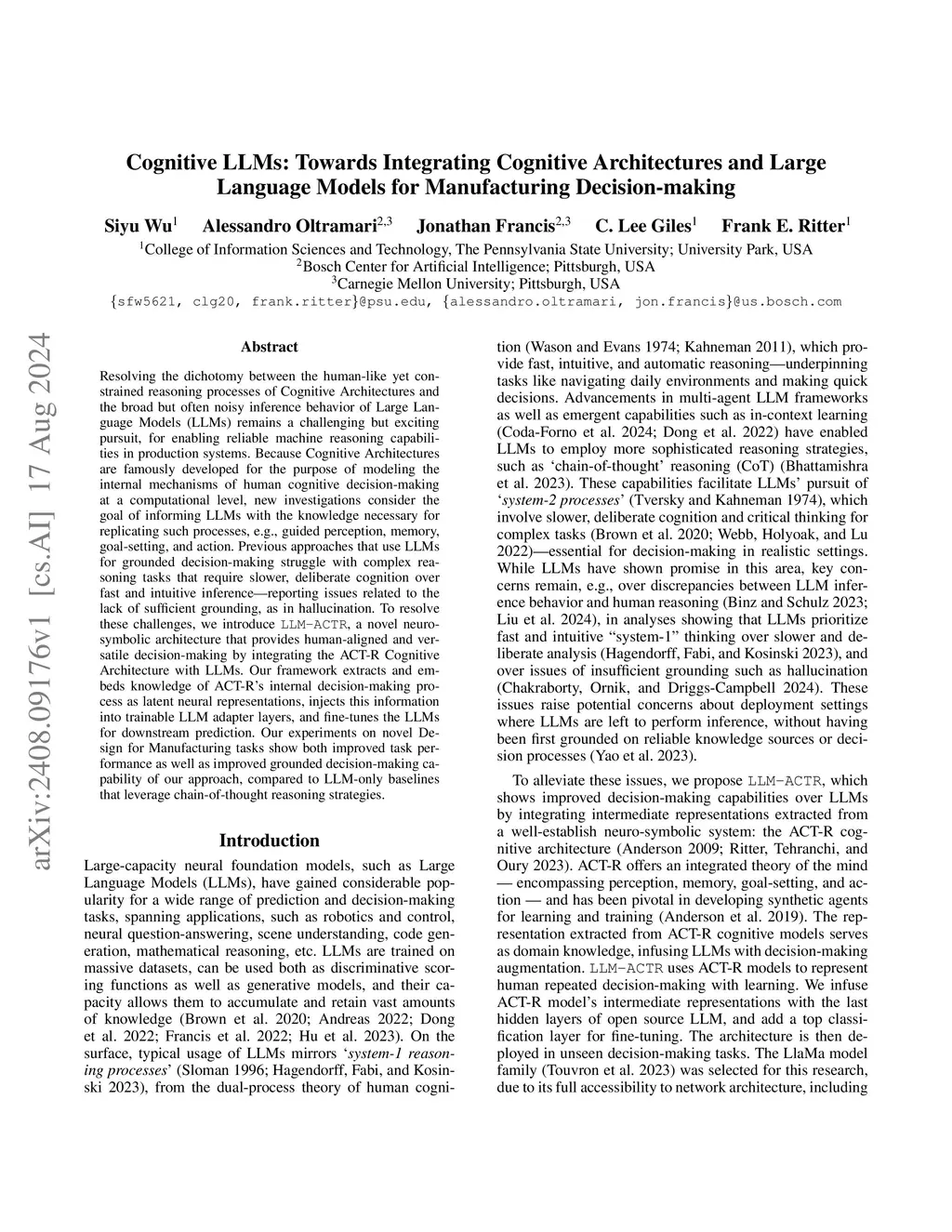 Resolving the dichotomy between the human-like yet constrained reasoning processes of Cognitive Architectures and the broad but often noisy inference behavior of Large Language Models (LLMs) remains a challenging but exciting pursuit, for enabling reliable machine reasoning capabilities in production systems. Because Cognitive Architectures are famously developed for the purpose of modeling the internal mechanisms of human cognitive decision-making at a computational level, new investigations consider the goal of informing LLMs with the knowledge necessary for replicating such processes, e.g., guided perception, memory, goal-setting, and action. Previous approaches that use LLMs for grounded decision-making struggle with complex reasoning tasks that require slower, deliberate cognition over fast and intuitive inference -- reporting issues related to the lack of sufficient grounding, as in hallucination. To resolve these challenges, we introduce LLM-ACTR, a novel neuro-symbolic architecture that provides human-aligned and versatile decision-making by integrating the ACT-R Cognitive Architecture with LLMs. Our framework extracts and embeds knowledge of ACT-R's internal decision-making process as latent neural representations, injects this information into trainable LLM adapter layers, and fine-tunes the LLMs for downstream prediction. Our experiments on novel Design for Manufacturing tasks show both improved task performance as well as improved grounded decision-making capability of our approach, compared to LLM-only baselines that leverage chain-of-thought reasoning strategies.