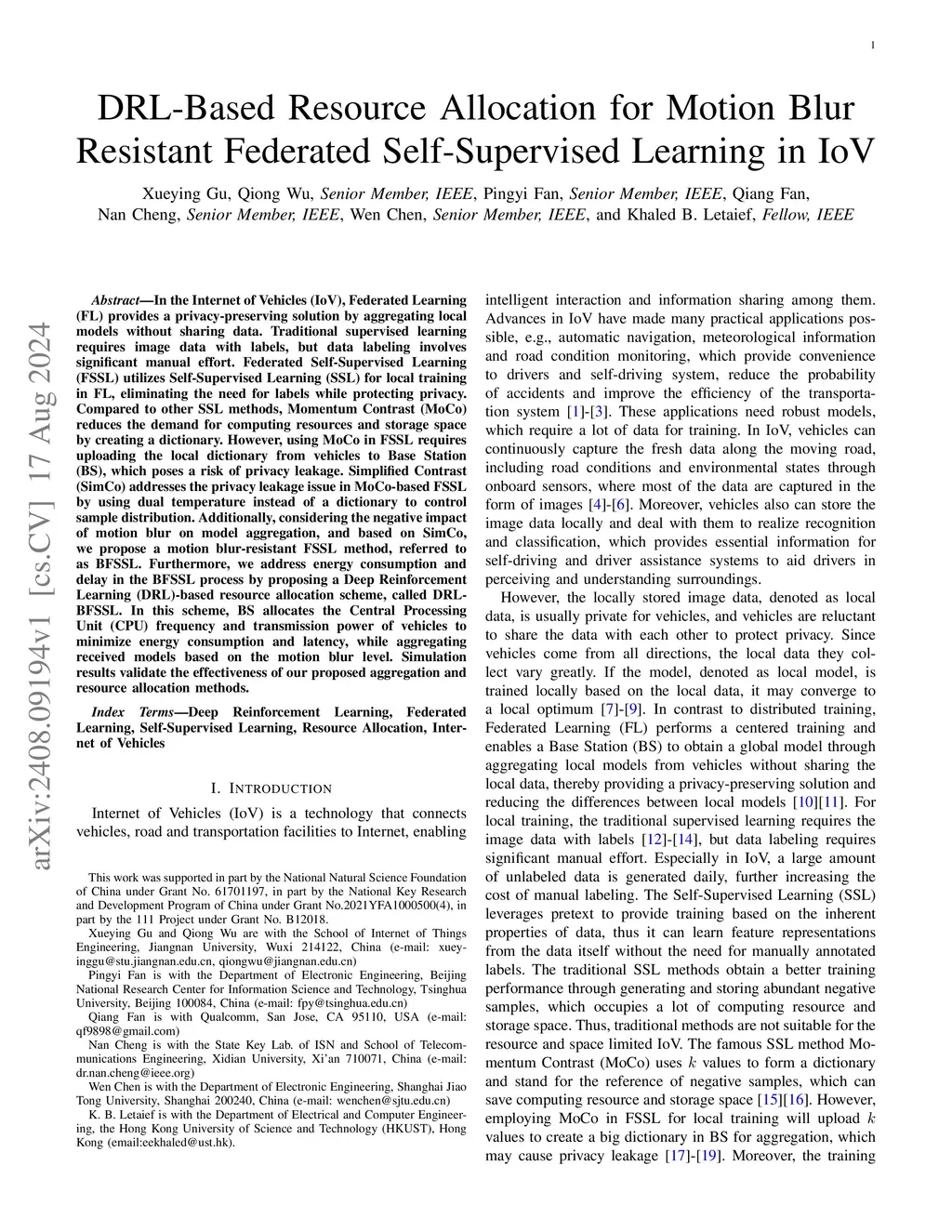 DRL-Based Resource Allocation for Motion Blur Resistant Federated Self-Supervised Learning in IoV