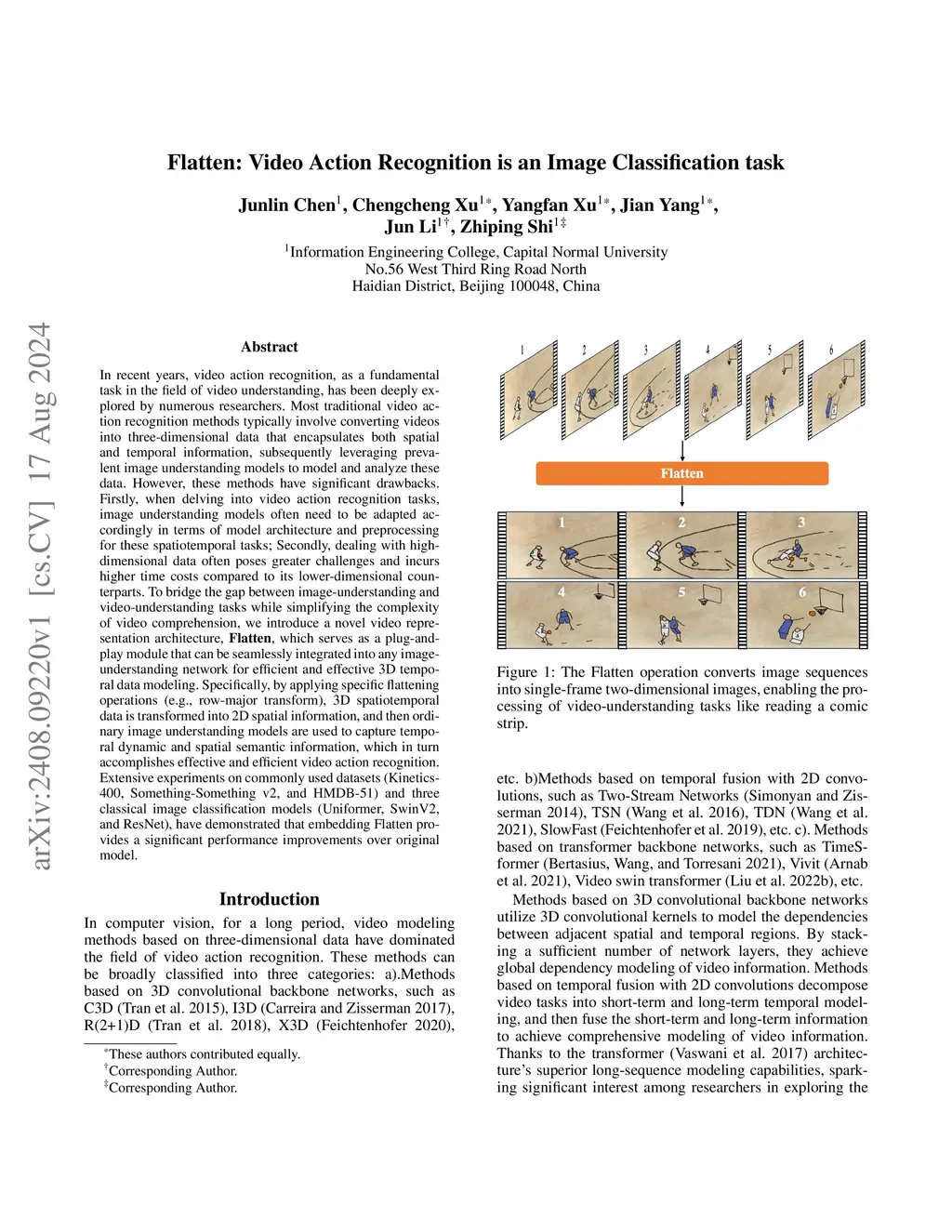 In recent years, video action recognition, as a fundamental task in the field of video understanding, has been deeply explored by numerous researchers.Most traditional video action recognition methods typically involve converting videos into three-dimensional data that encapsulates both spatial and temporal information, subsequently leveraging prevalent image understanding models to model and analyze these data. However,these methods have significant drawbacks. Firstly, when delving into video action recognition tasks, image understanding models often need to be adapted accordingly in terms of model architecture and preprocessing for these spatiotemporal tasks; Secondly, dealing with high-dimensional data often poses greater challenges and incurs higher time costs compared to its lower-dimensional counterparts.To bridge the gap between image-understanding and video-understanding tasks while simplifying the complexity of video comprehension, we introduce a novel video representation architecture, Flatten, which serves as a plug-and-play module that can be seamlessly integrated into any image-understanding network for efficient and effective 3D temporal data modeling.Specifically, by applying specific flattening operations (e.g., row-major transform), 3D spatiotemporal data is transformed into 2D spatial information, and then ordinary image understanding models are used to capture temporal dynamic and spatial semantic information, which in turn accomplishes effective and efficient video action recognition. Extensive experiments on commonly used datasets (Kinetics-400, Something-Something v2, and HMDB-51) and three classical image classification models (Uniformer, SwinV2, and ResNet), have demonstrated that embedding Flatten provides a significant performance improvements over original model.