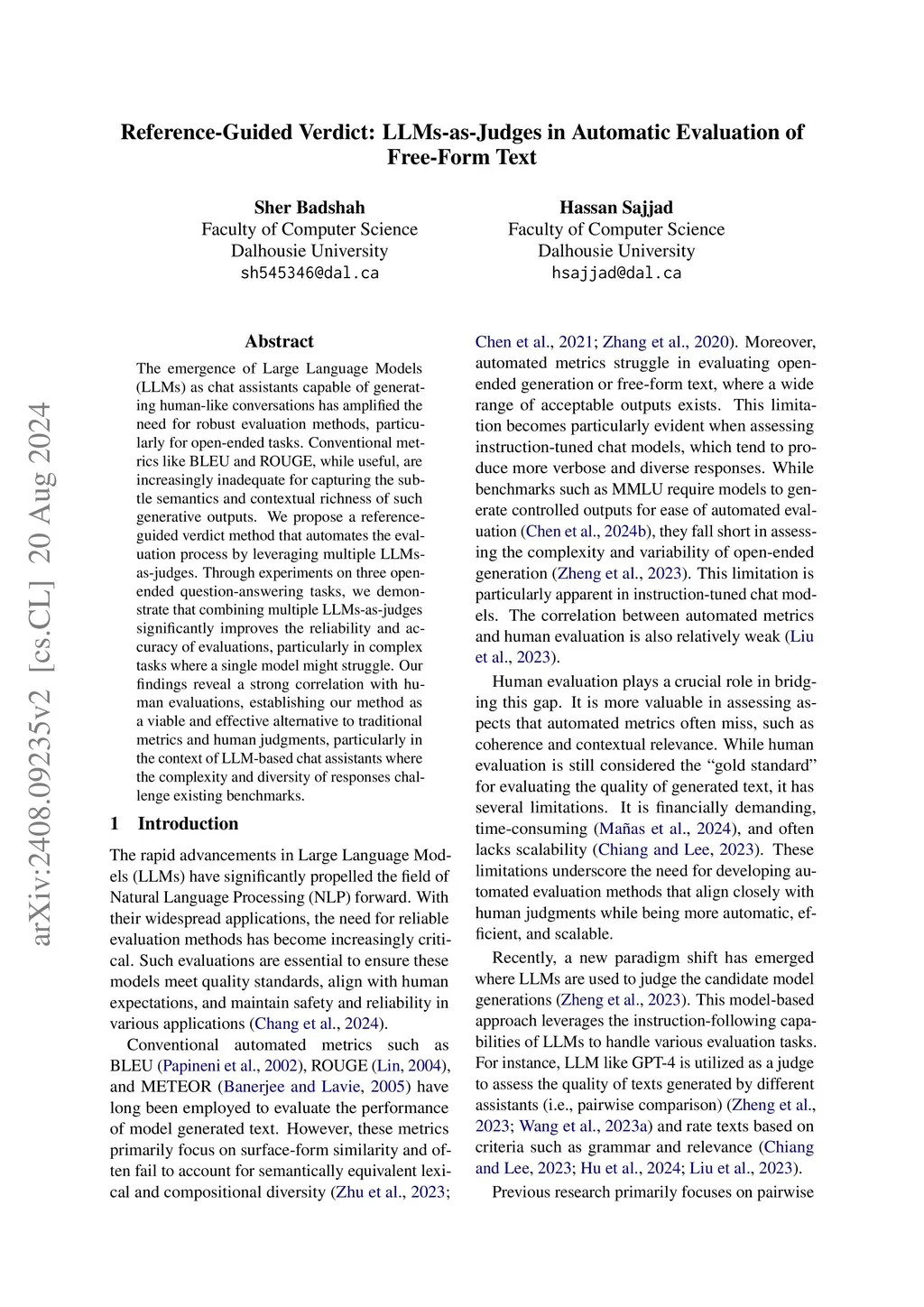 The emergence of Large Language Models (LLMs) as chat assistants capable of generating human-like conversations has amplified the need for robust evaluation methods, particularly for open-ended tasks. Conventional metrics such as EM and F1, while useful, are inadequate for capturing the full semantics and contextual depth of such generative outputs. We propose a reference-guided verdict method that automates the evaluation process by leveraging multiple LLMs as judges. Through experiments on free-form question-answering tasks, we demonstrate that combining multiple models improves the reliability and accuracy of evaluations, especially in tasks where a single model may struggle. The results indicate a strong correlation with human evaluations, establishing the proposed method as a reliable alternative to traditional metrics.