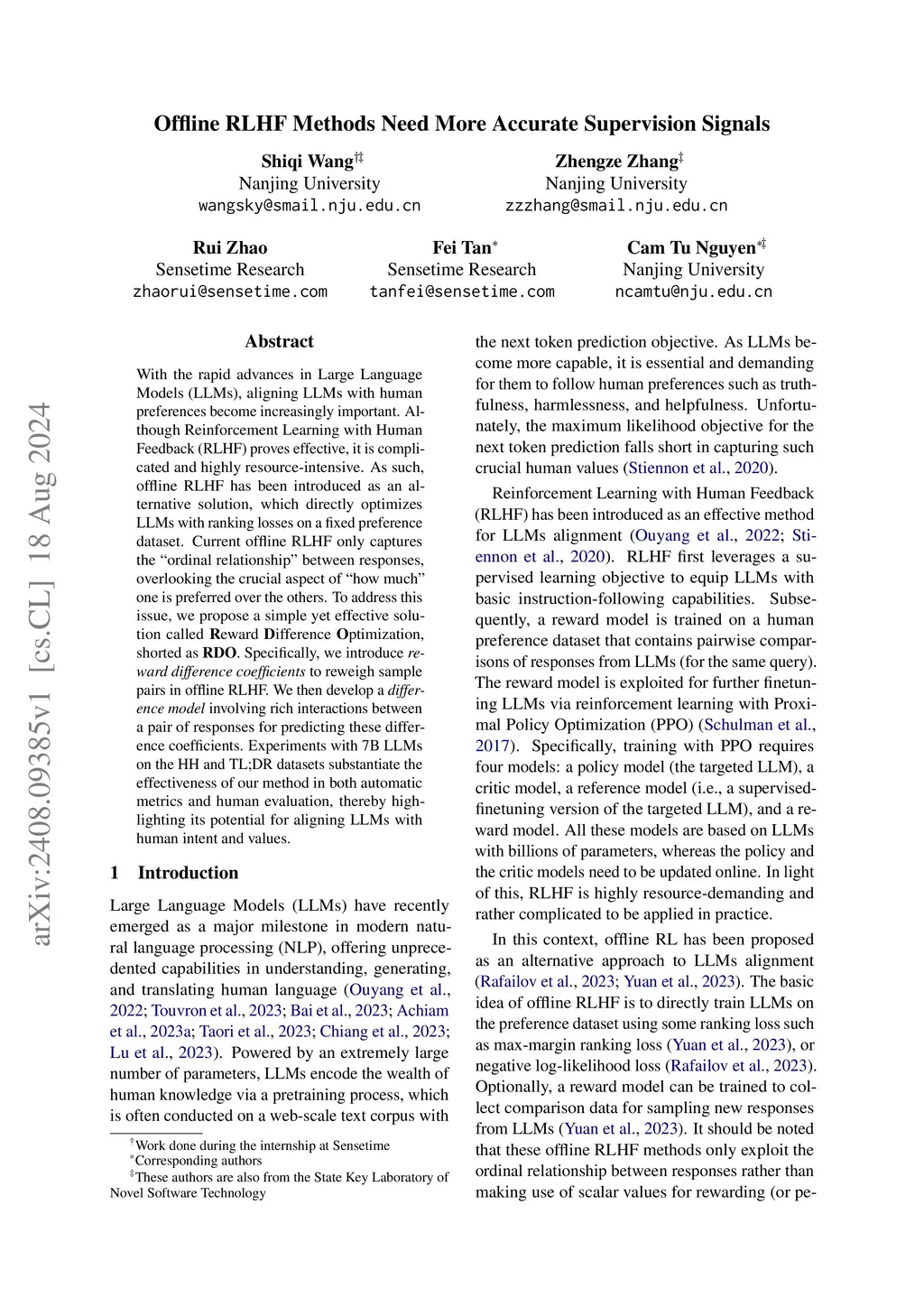 With the rapid advances in Large Language Models (LLMs), aligning LLMs with human preferences become increasingly important. Although Reinforcement Learning with Human Feedback (RLHF) proves effective, it is complicated and highly resource-intensive. As such, offline RLHF has been introduced as an alternative solution, which directly optimizes LLMs with ranking losses on a fixed preference dataset. Current offline RLHF only captures the ``ordinal relationship'' between responses, overlooking the crucial aspect of ``how much'' one is preferred over the others. To address this issue, we propose a simple yet effective solution called \textbf{R}eward \textbf{D}ifference \textbf{O}ptimization, shorted as \textbf{RDO}. Specifically, we introduce {\it reward difference coefficients} to reweigh sample pairs in offline RLHF. We then develop a {\it difference model} involving rich interactions between a pair of responses for predicting these difference coefficients. Experiments with 7B LLMs on the HH and TL;DR datasets substantiate the effectiveness of our method in both automatic metrics and human evaluation, thereby highlighting its potential for aligning LLMs with human intent and values.