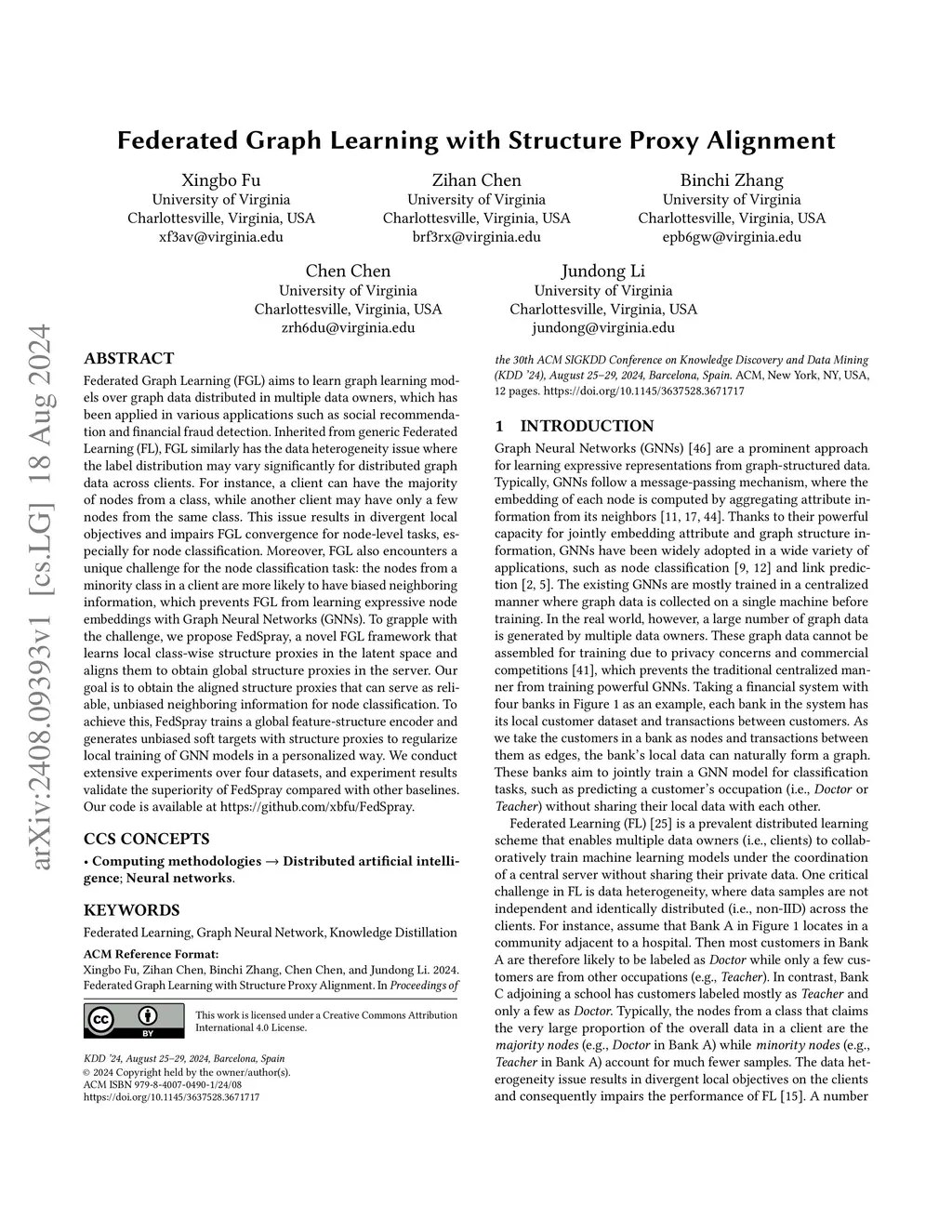 Federated Graph Learning (FGL) aims to learn graph learning models over graph data distributed in multiple data owners, which has been applied in various applications such as social recommendation and financial fraud detection. Inherited from generic Federated Learning (FL), FGL similarly has the data heterogeneity issue where the label distribution may vary significantly for distributed graph data across clients. For instance, a client can have the majority of nodes from a class, while another client may have only a few nodes from the same class. This issue results in divergent local objectives and impairs FGL convergence for node-level tasks, especially for node classification. Moreover, FGL also encounters a unique challenge for the node classification task: the nodes from a minority class in a client are more likely to have biased neighboring information, which prevents FGL from learning expressive node embeddings with Graph Neural Networks (GNNs). To grapple with the challenge, we propose FedSpray, a novel FGL framework that learns local class-wise structure proxies in the latent space and aligns them to obtain global structure proxies in the server. Our goal is to obtain the aligned structure proxies that can serve as reliable, unbiased neighboring information for node classification. To achieve this, FedSpray trains a global feature-structure encoder and generates unbiased soft targets with structure proxies to regularize local training of GNN models in a personalized way. We conduct extensive experiments over four datasets, and experiment results validate the superiority of FedSpray compared with other baselines. Our code is available at https://github.com/xbfu/FedSpray.