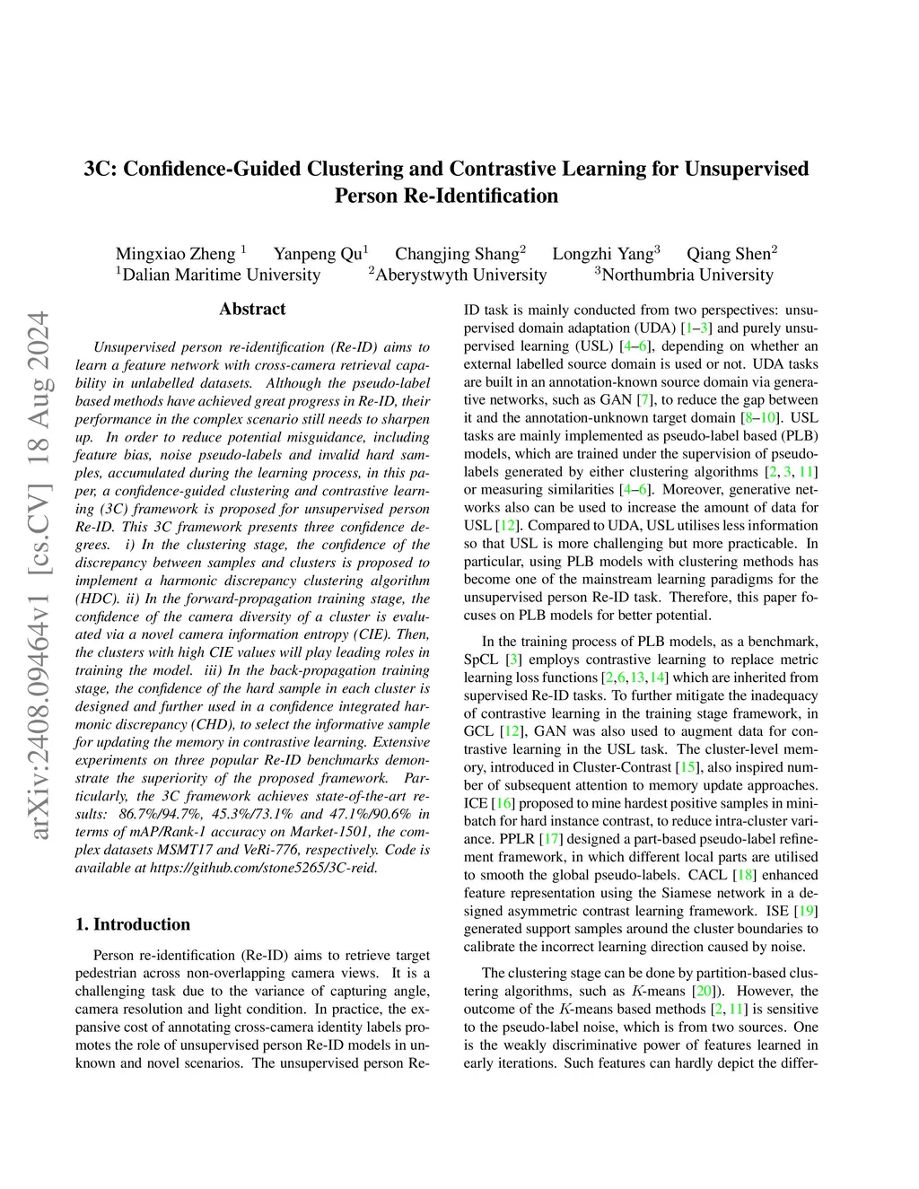 Unsupervised person re-identification (Re-ID) aims to learn a feature network with cross-camera retrieval capability in unlabelled datasets. Although the pseudo-label based methods have achieved great progress in Re-ID, their performance in the complex scenario still needs to sharpen up. In order to reduce potential misguidance, including feature bias, noise pseudo-labels and invalid hard samples, accumulated during the learning process, in this pa per, a confidence-guided clustering and contrastive learning (3C) framework is proposed for unsupervised person Re-ID. This 3C framework presents three confidence degrees. i) In the clustering stage, the confidence of the discrepancy between samples and clusters is proposed to implement a harmonic discrepancy clustering algorithm (HDC). ii) In the forward-propagation training stage, the confidence of the camera diversity of a cluster is evaluated via a novel camera information entropy (CIE). Then, the clusters with high CIE values will play leading roles in training the model. iii) In the back-propagation training stage, the confidence of the hard sample in each cluster is designed and further used in a confidence integrated harmonic discrepancy (CHD), to select the informative sample for updating the memory in contrastive learning. Extensive experiments on three popular Re-ID benchmarks demonstrate the superiority of the proposed framework. Particularly, the 3C framework achieves state-of-the-art results: 86.7%/94.7%, 45.3%/73.1% and 47.1%/90.6% in terms of mAP/Rank-1 accuracy on Market-1501, the com plex datasets MSMT17 and VeRi-776, respectively. Code is available at https://github.com/stone5265/3C-reid.