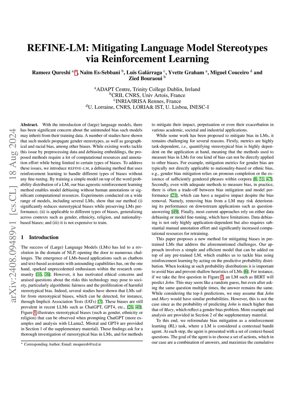 With the introduction of (large) language models, there has been significant concern about the unintended bias such models may inherit from their training data. A number of studies have shown that such models propagate gender stereotypes, as well as geographical and racial bias, among other biases. While existing works tackle this issue by preprocessing data and debiasing embeddings, the proposed methods require a lot of computational resources and annotation effort while being limited to certain types of biases. To address these issues, we introduce REFINE-LM, a debiasing method that uses reinforcement learning to handle different types of biases without any fine-tuning. By training a simple model on top of the word probability distribution of a LM, our bias agnostic reinforcement learning method enables model debiasing without human annotations or significant computational resources. Experiments conducted on a wide range of models, including several LMs, show that our method (i) significantly reduces stereotypical biases while preserving LMs performance; (ii) is applicable to different types of biases, generalizing across contexts such as gender, ethnicity, religion, and nationality-based biases; and (iii) it is not expensive to train.