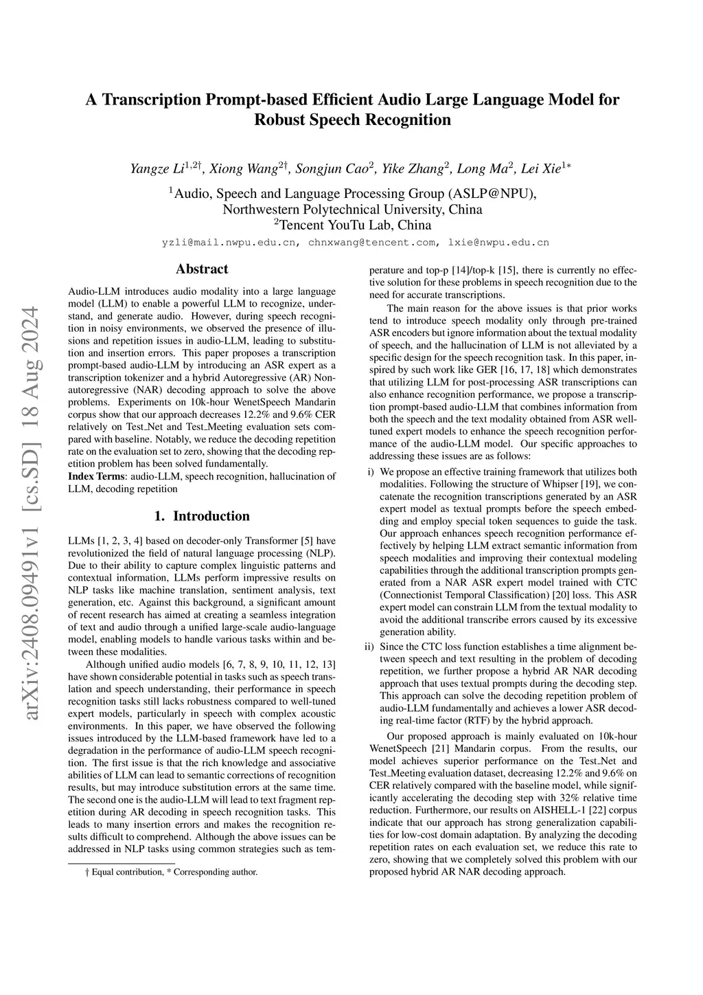 Audio-LLM introduces audio modality into a large language model (LLM) to enable a powerful LLM to recognize, understand, and generate audio. However, during speech recognition in noisy environments, we observed the presence of illusions and repetition issues in audio-LLM, leading to substitution and insertion errors. This paper proposes a transcription prompt-based audio-LLM by introducing an ASR expert as a transcription tokenizer and a hybrid Autoregressive (AR) Non-autoregressive (NAR) decoding approach to solve the above problems. Experiments on 10k-hour WenetSpeech Mandarin corpus show that our approach decreases 12.2% and 9.6% CER relatively on Test_Net and Test_Meeting evaluation sets compared with baseline. Notably, we reduce the decoding repetition rate on the evaluation set to zero, showing that the decoding repetition problem has been solved fundamentally.