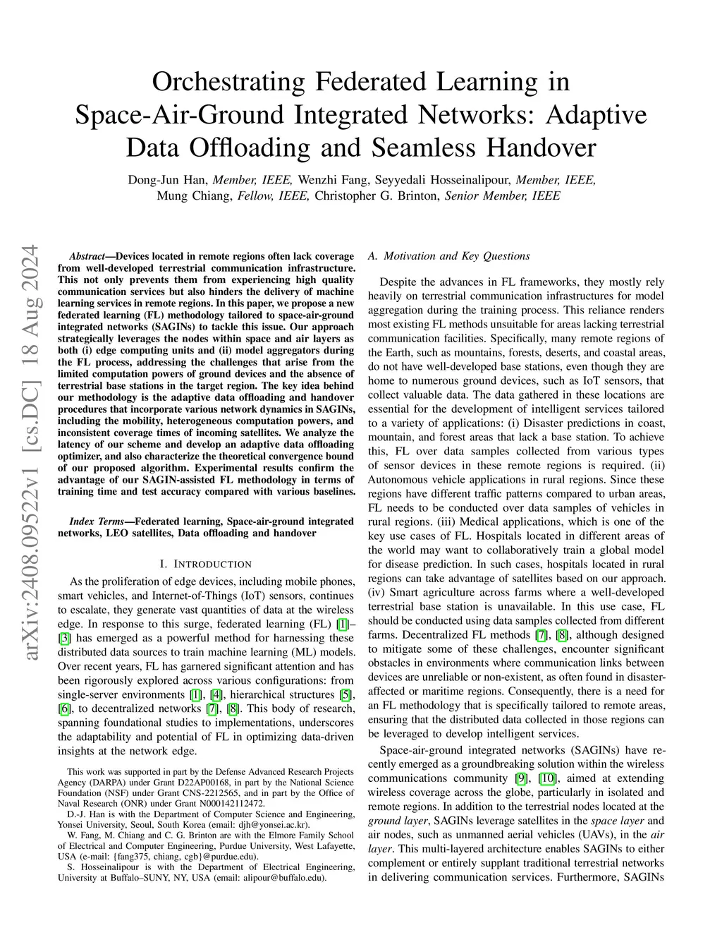 Devices located in remote regions often lack coverage from well-developed terrestrial communication infrastructure. This not only prevents them from experiencing high quality communication services but also hinders the delivery of machine learning services in remote regions. In this paper, we propose a new federated learning (FL) methodology tailored to space-air-ground integrated networks (SAGINs) to tackle this issue. Our approach strategically leverages the nodes within space and air layers as both (i) edge computing units and (ii) model aggregators during the FL process, addressing the challenges that arise from the limited computation powers of ground devices and the absence of terrestrial base stations in the target region. The key idea behind our methodology is the adaptive data offloading and handover procedures that incorporate various network dynamics in SAGINs, including the mobility, heterogeneous computation powers, and inconsistent coverage times of incoming satellites. We analyze the latency of our scheme and develop an adaptive data offloading optimizer, and also characterize the theoretical convergence bound of our proposed algorithm. Experimental results confirm the advantage of our SAGIN-assisted FL methodology in terms of training time and test accuracy compared with various baselines.