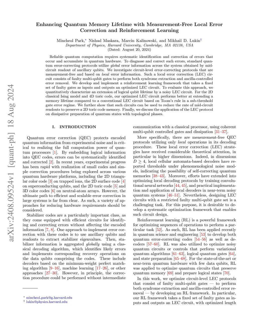 Reliable quantum computation requires systematic identification and correction of errors that occur and accumulate in quantum hardware. To diagnose and correct such errors, standard quantum error-correcting protocols utilize error information across the system obtained by mid-circuit readout of ancillary qubits. We investigate circuit-level error-correcting protocols that are measurement-free and based on error information. Such a local error correction (LEC) circuit consists of faulty multi-qubit gates to perform both syndrome extraction and ancilla-controlled error removal. We develop and implement a reinforcement learning framework that takes a fixed set of faulty gates as inputs and outputs an optimized LEC circuit. To evaluate this approach, we quantitatively characterize an extension of logical qubit lifetime by a noisy LEC circuit. For the 2D classical Ising model and 4D toric code, our optimized LEC circuit performs better at extending a memory lifetime compared to a conventional LEC circuit based on Toom's rule in a sub-threshold gate error regime. We further show that such circuits can be used to reduce the rate of mid-circuit readouts to preserve a 2D toric code memory. Finally, we discuss the application of the LEC protocol on dissipative preparation of quantum states with topological phases.
