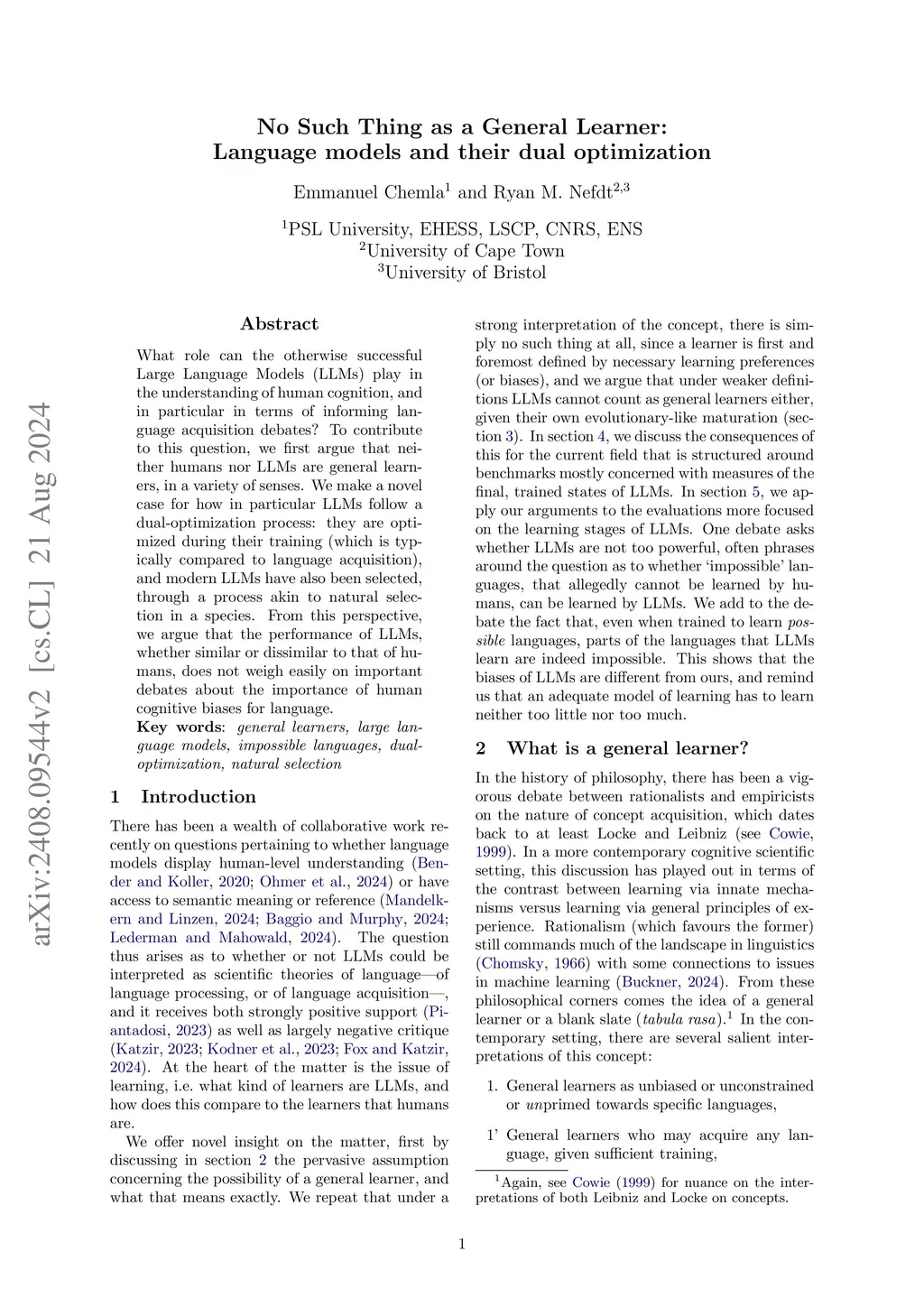 What role can the otherwise successful Large Language Models (LLMs) play in the understanding of human cognition, and in particular in terms of informing language acquisition debates? To contribute to this question, we first argue that neither humans nor LLMs are general learners, in a variety of senses. We make a novel case for how in particular LLMs follow a dual-optimization process: they are optimized during their training (which is typically compared to language acquisition), and modern LLMs have also been selected, through a process akin to natural selection in a species. From this perspective, we argue that the performance of LLMs, whether similar or dissimilar to that of humans, does not weigh easily on important debates about the importance of human cognitive biases for language.
