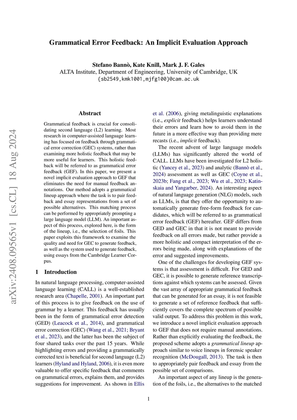 Grammatical Error Feedback: An Implicit Evaluation Approach