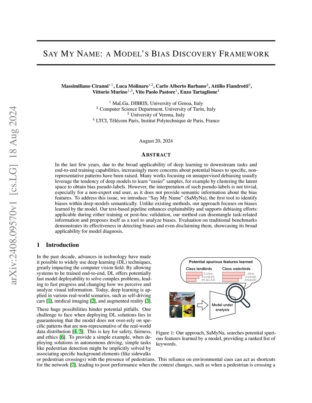 In the last few years, due to the broad applicability of deep learning to downstream tasks and end-to-end training capabilities, increasingly more concerns about potential biases to specific, non-representative patterns have been raised. Many works focusing on unsupervised debiasing usually leverage the tendency of deep models to learn ``easier'' samples, for example by clustering the latent space to obtain bias pseudo-labels. However, the interpretation of such pseudo-labels is not trivial, especially for a non-expert end user, as it does not provide semantic information about the bias features. To address this issue, we introduce ``Say My Name'' (SaMyNa), the first tool to identify biases within deep models semantically. Unlike existing methods, our approach focuses on biases learned by the model. Our text-based pipeline enhances explainability and supports debiasing efforts: applicable during either training or post-hoc validation, our method can disentangle task-related information and proposes itself as a tool to analyze biases. Evaluation on traditional benchmarks demonstrates its effectiveness in detecting biases and even disclaiming them, showcasing its broad applicability for model diagnosis.