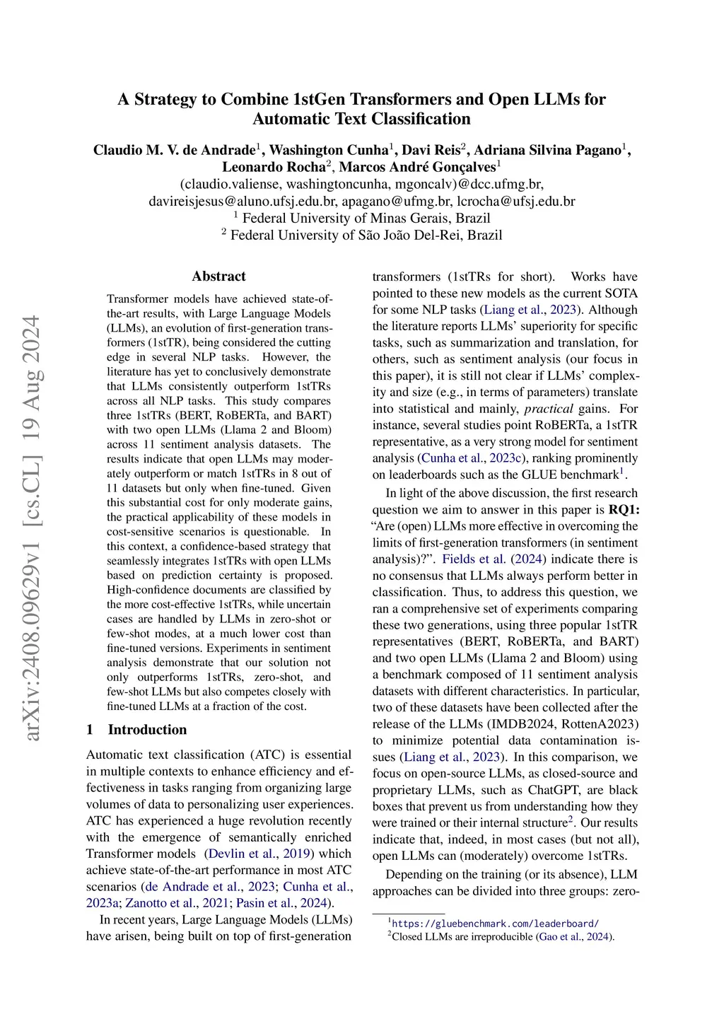 Transformer models have achieved state-of-the-art results, with Large Language Models (LLMs), an evolution of first-generation transformers (1stTR), being considered the cutting edge in several NLP tasks. However, the literature has yet to conclusively demonstrate that LLMs consistently outperform 1stTRs across all NLP tasks. This study compares three 1stTRs (BERT, RoBERTa, and BART) with two open LLMs (Llama 2 and Bloom) across 11 sentiment analysis datasets. The results indicate that open LLMs may moderately outperform or match 1stTRs in 8 out of 11 datasets but only when fine-tuned. Given this substantial cost for only moderate gains, the practical applicability of these models in cost-sensitive scenarios is questionable. In this context, a confidence-based strategy that seamlessly integrates 1stTRs with open LLMs based on prediction certainty is proposed. High-confidence documents are classified by the more cost-effective 1stTRs, while uncertain cases are handled by LLMs in zero-shot or few-shot modes, at a much lower cost than fine-tuned versions. Experiments in sentiment analysis demonstrate that our solution not only outperforms 1stTRs, zero-shot, and few-shot LLMs but also competes closely with fine-tuned LLMs at a fraction of the cost.