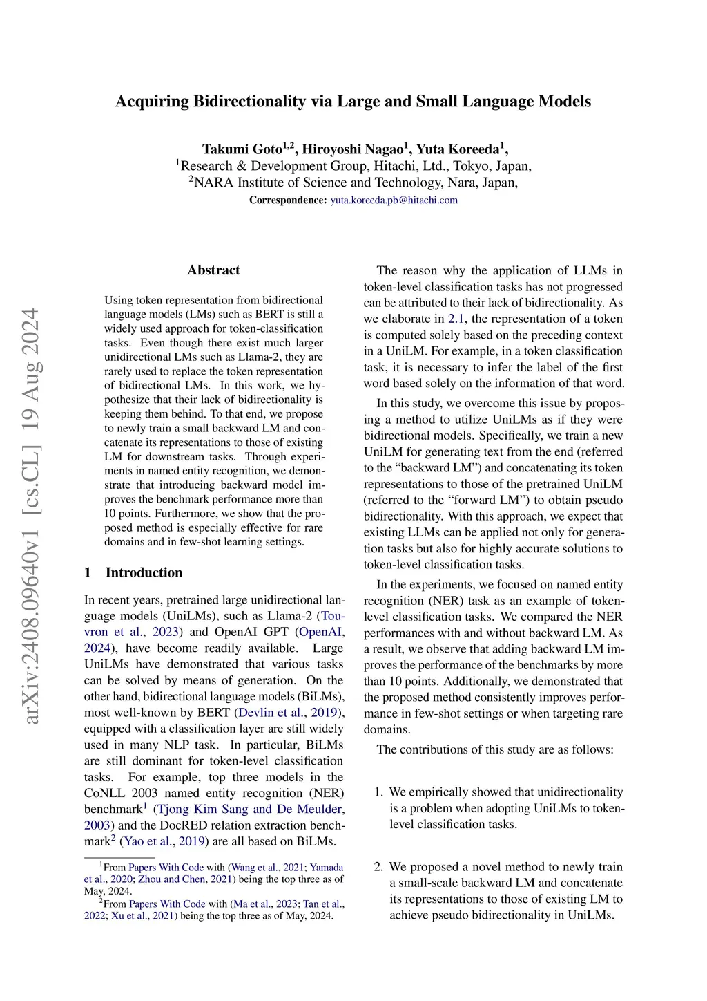 Using token representation from bidirectional language models (LMs) such as BERT is still a widely used approach for token-classification tasks. Even though there exist much larger unidirectional LMs such as Llama-2, they are rarely used to replace the token representation of bidirectional LMs. In this work, we hypothesize that their lack of bidirectionality is keeping them behind. To that end, we propose to newly train a small backward LM and concatenate its representations to those of existing LM for downstream tasks. Through experiments in named entity recognition, we demonstrate that introducing backward model improves the benchmark performance more than 10 points. Furthermore, we show that the proposed method is especially effective for rare domains and in few-shot learning settings.