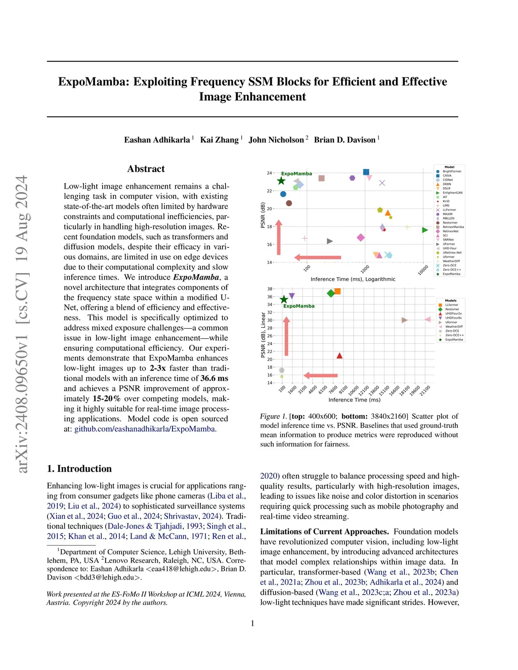 Low-light image enhancement remains a persistent challenge in computer vision, where state-of-the-art models are often hampered by hardware constraints and computational inefficiency, particularly at high resolutions. While foundational architectures like transformers and diffusion models have advanced the field, their computational complexity limits their deployment on edge devices. We introduce ExpoMamba, a novel architecture that integrates a frequency-aware state-space model within a modified U-Net. ExpoMamba is designed to address mixed-exposure challenges by decoupling the modeling of amplitude (intensity) and phase (structure) in the frequency domain. This allows for targeted enhancement, making it highly effective for real-time applications, including downstream tasks like object detection and segmentation. Our experiments on six benchmark datasets show that ExpoMamba is up to 2-3x faster than competing models and achieves a 6.8\% PSNR improvement, establishing a new state-of-the-art in efficient, high-quality low-light enhancement. Source code:this https URL.