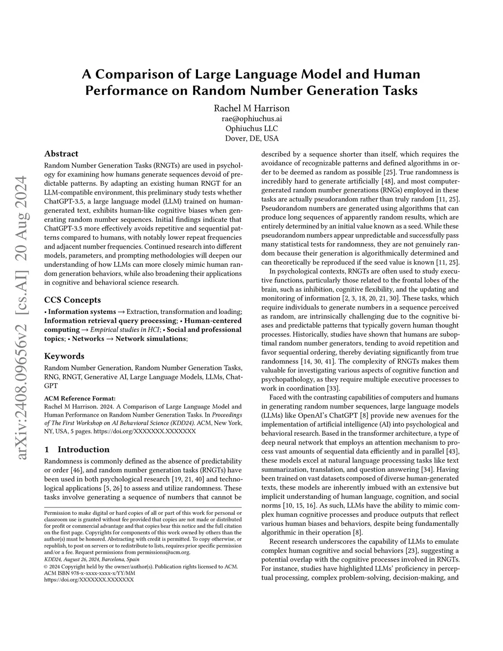 Random Number Generation Tasks (RNGTs) are used in psychology for examining how humans generate sequences devoid of predictable patterns. By adapting an existing human RNGT for an LLM-compatible environment, this preliminary study tests whether ChatGPT-3.5, a large language model (LLM) trained on human-generated text, exhibits human-like cognitive biases when generating random number sequences. Initial findings indicate that ChatGPT-3.5 more effectively avoids repetitive and sequential patterns compared to humans, with notably lower repeat frequencies and adjacent number frequencies. Continued research into different models, parameters, and prompting methodologies will deepen our understanding of how LLMs can more closely mimic human random generation behaviors, while also broadening their applications in cognitive and behavioral science research.