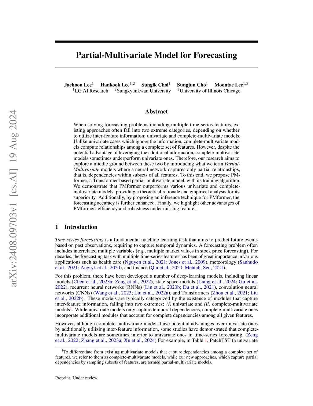 When solving forecasting problems including multiple time-series features, existing approaches often fall into two extreme categories, depending on whether to utilize inter-feature information: univariate and complete-multivariate models. Unlike univariate cases which ignore the information, complete-multivariate models compute relationships among a complete set of features. However, despite the potential advantage of leveraging the additional information, complete-multivariate models sometimes underperform univariate ones. Therefore, our research aims to explore a middle ground between these two by introducing what we term Partial-Multivariate models where a neural network captures only partial relationships, that is, dependencies within subsets of all features. To this end, we propose PMformer, a Transformer-based partial-multivariate model, with its training algorithm. We demonstrate that PMformer outperforms various univariate and complete-multivariate models, providing a theoretical rationale and empirical analysis for its superiority. Additionally, by proposing an inference technique for PMformer, the forecasting accuracy is further enhanced. Finally, we highlight other advantages of PMformer: efficiency and robustness under missing features.