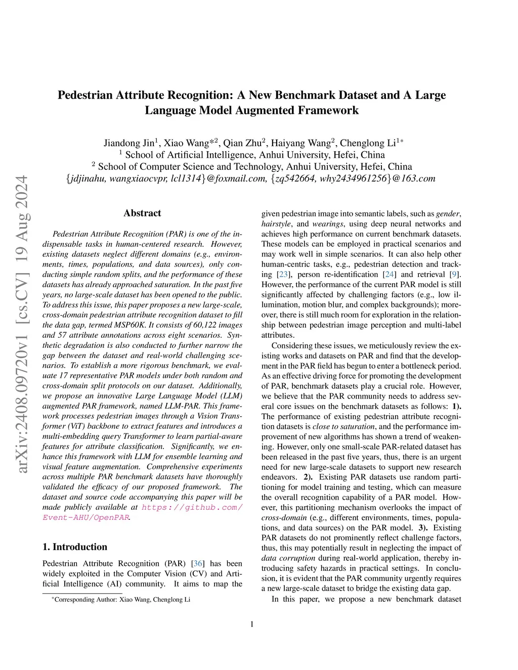 Pedestrian Attribute Recognition (PAR) is one of the indispensable tasks in human-centered research. However, existing datasets neglect different domains (e.g., environments, times, populations, and data sources), only conducting simple random splits, and the performance of these datasets has already approached saturation. In the past five years, no large-scale dataset has been opened to the public. To address this issue, this paper proposes a new large-scale, cross-domain pedestrian attribute recognition dataset to fill the data gap, termed MSP60K. It consists of 60,122 images and 57 attribute annotations across eight scenarios. Synthetic degradation is also conducted to further narrow the gap between the dataset and real-world challenging scenarios. To establish a more rigorous benchmark, we evaluate 17 representative PAR models under both random and cross-domain split protocols on our dataset. Additionally, we propose an innovative Large Language Model (LLM) augmented PAR framework, named LLM-PAR. This framework processes pedestrian images through a Vision Transformer (ViT) backbone to extract features and introduces a multi-embedding query Transformer to learn partial-aware features for attribute classification. Significantly, we enhance this framework with LLM for ensemble learning and visual feature augmentation. Comprehensive experiments across multiple PAR benchmark datasets have thoroughly validated the efficacy of our proposed framework. The dataset and source code accompanying this paper will be made publicly available at \url{https://github.com/Event-AHU/OpenPAR}.