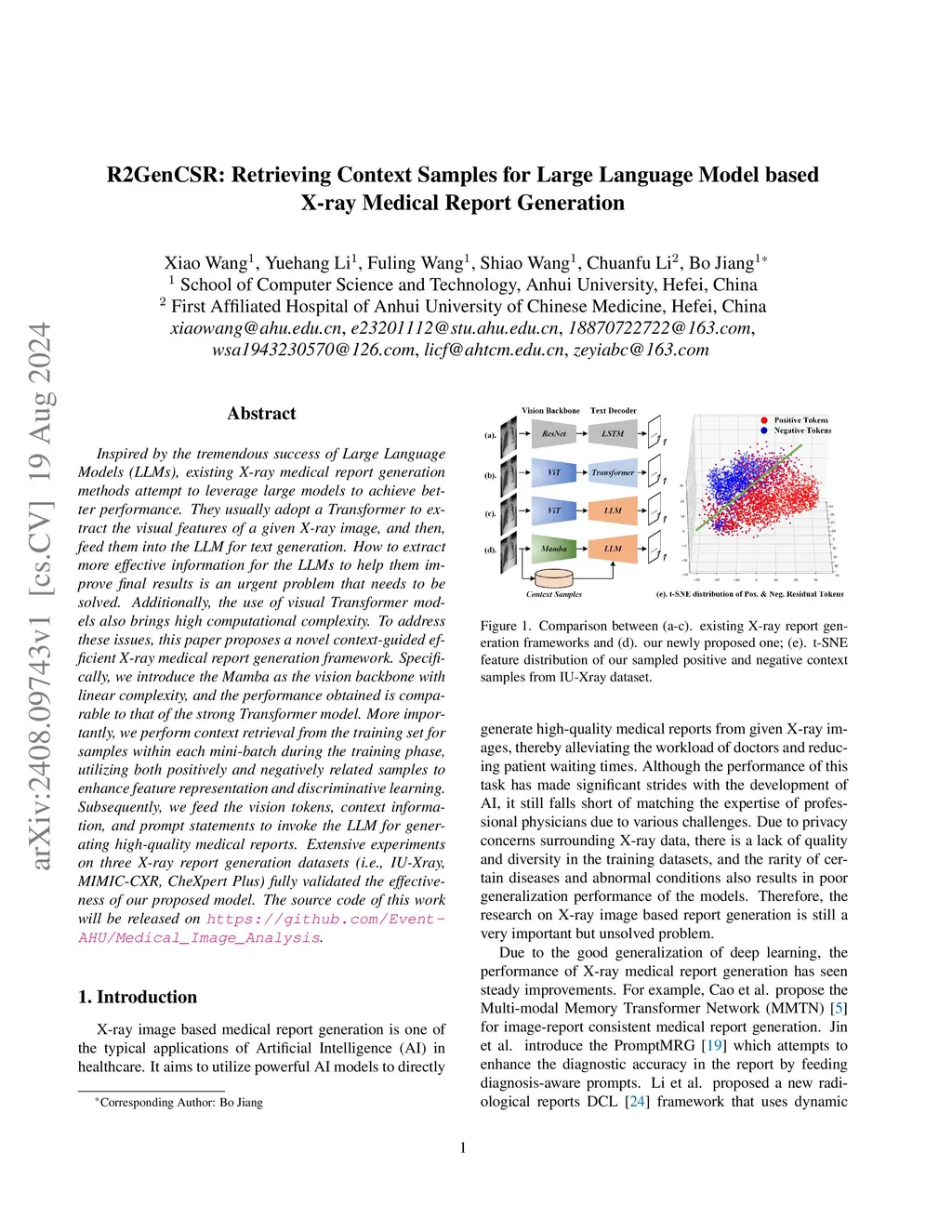 Inspired by the tremendous success of Large Language Models (LLMs), existing Radiology report generation methods attempt to leverage large models to achieve better performance. They usually adopt a Transformer to extract the visual features of a given X-ray image, and then, feed them into the LLM for text generation. How to extract more effective information for the LLMs to help them improve final results is an urgent problem that needs to be solved. Additionally, the use of visual Transformer models also brings high computational complexity. To address these issues, this paper proposes a novel context-guided efficient radiology report generation framework. Specifically, we introduce the Mamba as the vision backbone with linear complexity, and the performance obtained is comparable to that of the strong Transformer model. More importantly, we perform context retrieval from the training set for samples within each mini-batch during the training phase, utilizing both positively and negatively related samples to enhance feature representation and discriminative learning. Subsequently, we feed the vision tokens, context information, and prompt statements to invoke the LLM for generating high-quality medical reports. Extensive experiments on three X-ray report generation datasets (i.e., IU X-Ray, MIMIC-CXR, CheXpert Plus) fully validated the effectiveness of our proposed model. The source code is available atthis https URL.