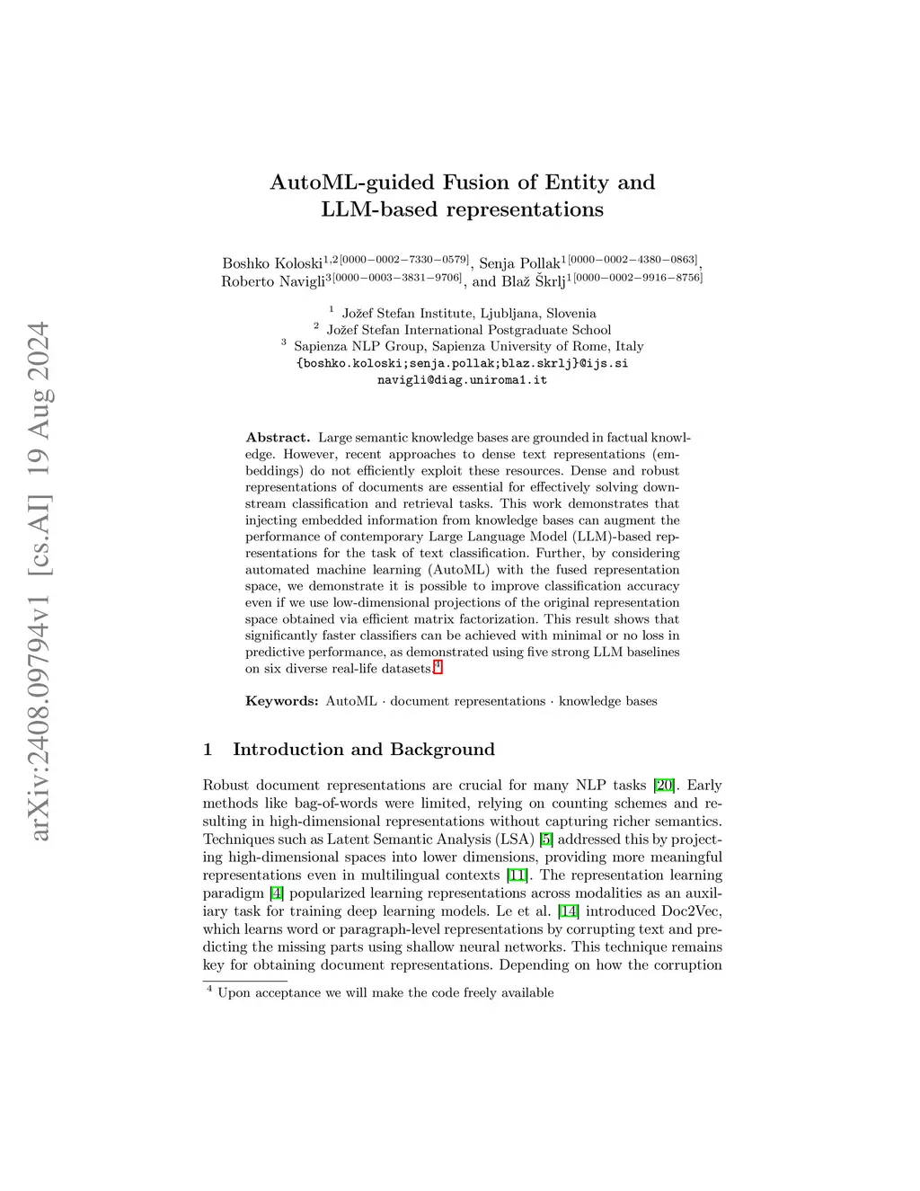Large semantic knowledge bases are grounded in factual knowledge. However, recent approaches to dense text representations (embeddings) do not efficiently exploit these resources. Dense and robust representations of documents are essential for effectively solving downstream classification and retrieval tasks. This work demonstrates that injecting embedded information from knowledge bases can augment the performance of contemporary Large Language Model (LLM)-based representations for the task of text classification. Further, by considering automated machine learning (AutoML) with the fused representation space, we demonstrate it is possible to improve classification accuracy even if we use low-dimensional projections of the original representation space obtained via efficient matrix factorization. This result shows that significantly faster classifiers can be achieved with minimal or no loss in predictive performance, as demonstrated using five strong LLM baselines on six diverse real-life datasets.