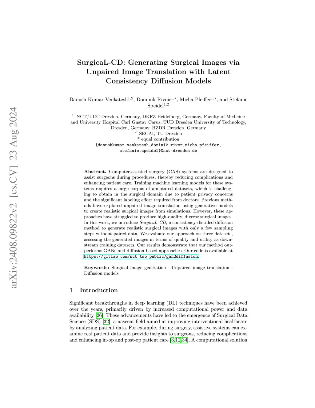 Computer-assisted surgery (CAS) systems are designed to assist surgeons during procedures, thereby reducing complications and enhancing patient care. Training machine learning models for these systems requires a large corpus of annotated datasets, which is challenging to obtain in the surgical domain due to patient privacy concerns and the significant labeling effort required from doctors. Previous methods have explored unpaired image translation using generative models to create realistic surgical images from simulations. However, these approaches have struggled to produce high-quality, diverse surgical images. In this work, we introduce \emph{SurgicaL-CD}, a consistency-distilled diffusion method to generate realistic surgical images with only a few sampling steps without paired data. We evaluate our approach on three datasets, assessing the generated images in terms of quality and utility as downstream training datasets. Our results demonstrate that our method outperforms GANs and diffusion-based approaches. Our code is available at https://gitlab.com/nct_tso_public/gan2diffusion.