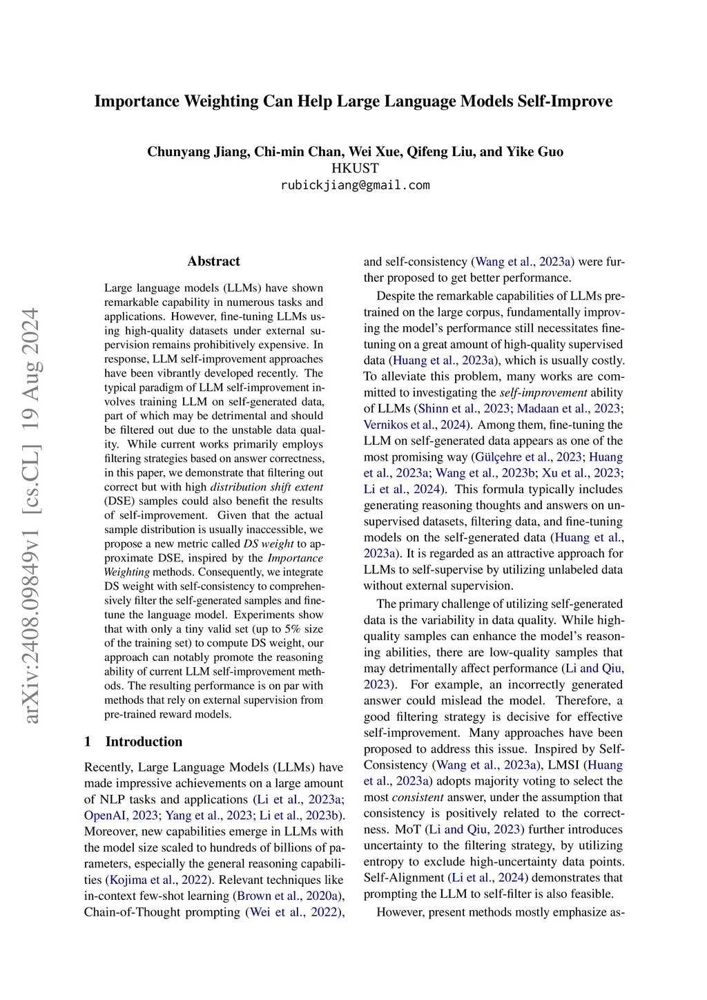 Large language models (LLMs) have shown remarkable capability in numerous tasks and applications. However, fine-tuning LLMs using high-quality datasets under external supervision remains prohibitively expensive. In response, LLM self-improvement approaches have been vibrantly developed recently. The typical paradigm of LLM self-improvement involves training LLM on self-generated data, part of which may be detrimental and should be filtered out due to the unstable data quality. While current works primarily employs filtering strategies based on answer correctness, in this paper, we demonstrate that filtering out correct but with high distribution shift extent (DSE) samples could also benefit the results of self-improvement. Given that the actual sample distribution is usually inaccessible, we propose a new metric called DS weight to approximate DSE, inspired by the Importance Weighting methods. Consequently, we integrate DS weight with self-consistency to comprehensively filter the self-generated samples and fine-tune the language model. Experiments show that with only a tiny valid set (up to 5\% size of the training set) to compute DS weight, our approach can notably promote the reasoning ability of current LLM self-improvement methods. The resulting performance is on par with methods that rely on external supervision from pre-trained reward models.