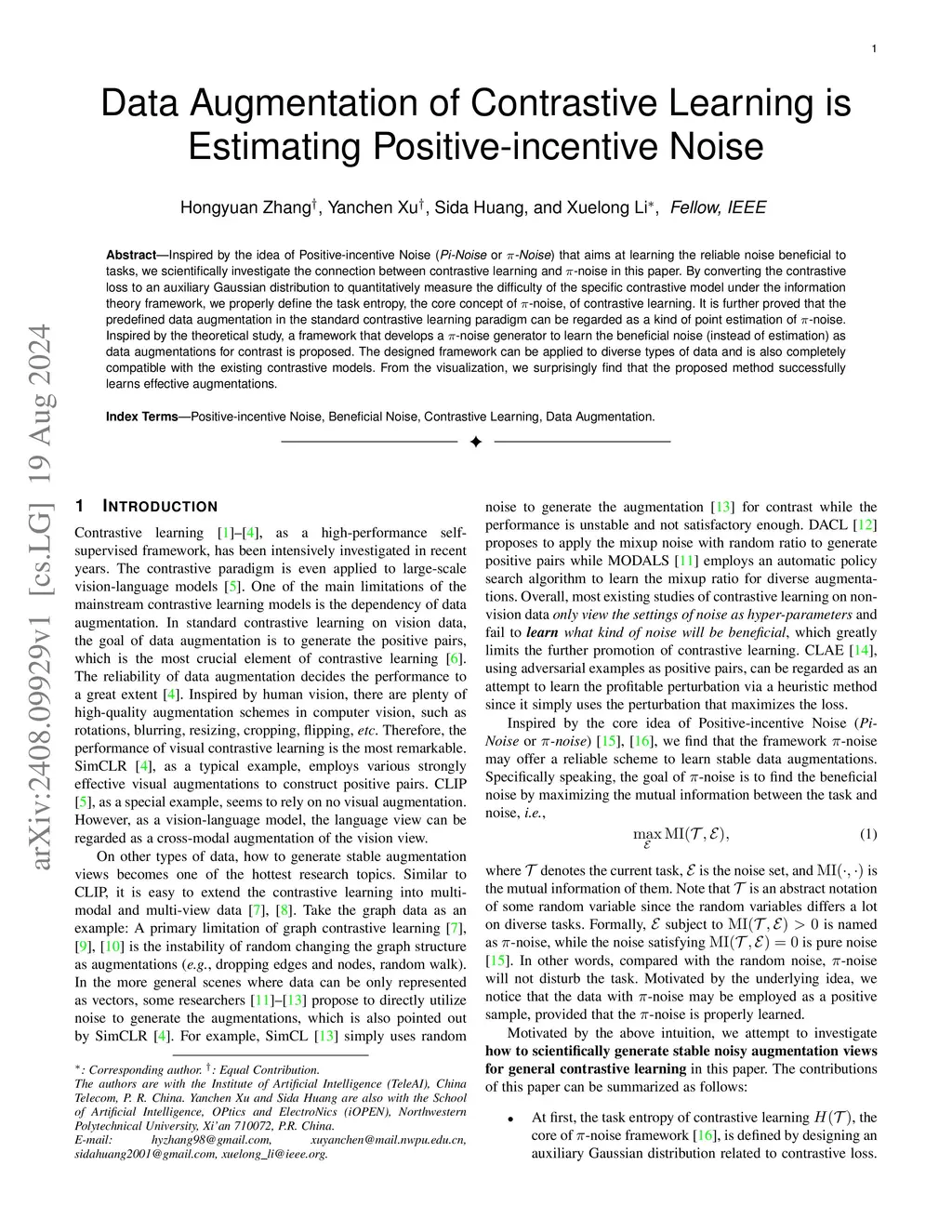Inspired by the idea of Positive-incentive Noise (Pi-Noise or -Noise) that aims at learning the reliable noise beneficial to tasks, we scientifically investigate the connection between contrastive learning and -noise in this paper. By converting the contrastive loss to an auxiliary Gaussian distribution to quantitatively measure the difficulty of the specific contrastive model under the information theory framework, we properly define the task entropy, the core concept of -noise, of contrastive learning. It is further proved that the predefined data augmentation in the standard contrastive learning paradigm can be regarded as a kind of point estimation of -noise. Inspired by the theoretical study, a framework that develops a -noise generator to learn the beneficial noise (instead of estimation) as data augmentations for contrast is proposed. The designed framework can be applied to diverse types of data and is also completely compatible with the existing contrastive models. From the visualization, we surprisingly find that the proposed method successfully learns effective augmentations.
