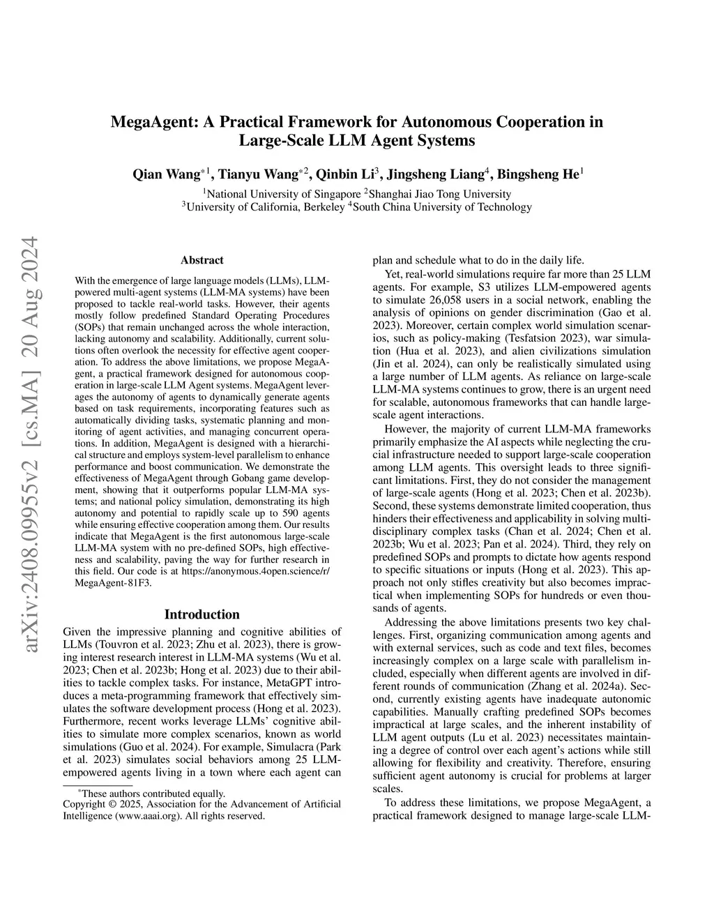 With the emergence of large language models (LLMs), LLM-powered multi-agent systems (LLM-MA systems) have been proposed to tackle real-world tasks. However, their agents mostly follow predefined Standard Operating Procedures (SOPs) that remain unchanged across the whole interaction, lacking autonomy and scalability. Additionally, current solutions often overlook the necessity for effective agent cooperation. To address the above limitations, we propose MegaAgent, a practical framework designed for autonomous cooperation in large-scale LLM Agent systems. MegaAgent leverages the autonomy of agents to dynamically generate agents based on task requirements, incorporating features such as automatically dividing tasks, systematic planning and monitoring of agent activities, and managing concurrent operations. In addition, MegaAgent is designed with a hierarchical structure and employs system-level parallelism to enhance performance and boost communication. We demonstrate the effectiveness of MegaAgent through Gobang game development, showing that it outperforms popular LLM-MA systems; and national policy simulation, demonstrating its high autonomy and potential to rapidly scale up to 590 agents while ensuring effective cooperation among them. Our results indicate that MegaAgent is the first autonomous large-scale LLM-MA system with no pre-defined SOPs, high effectiveness and scalability, paving the way for further research in this field. Our code is at https://anonymous.4open.science/r/MegaAgent-81F3.