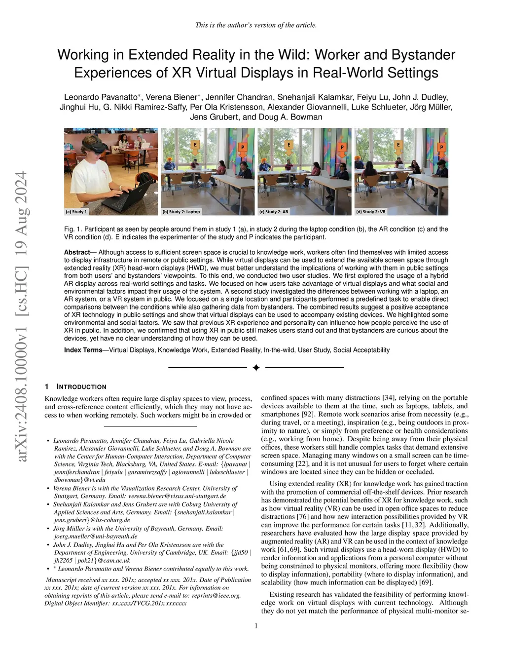 Although access to sufficient screen space is crucial to knowledge work, workers often find themselves with limited access to display infrastructure in remote or public settings. While virtual displays can be used to extend the available screen space through extended reality (XR) head-worn displays (HWD), we must better understand the implications of working with them in public settings from both users' and bystanders' viewpoints. To this end, we conducted two user studies. We first explored the usage of a hybrid AR display across real-world settings and tasks. We focused on how users take advantage of virtual displays and what social and environmental factors impact their usage of the system. A second study investigated the differences between working with a laptop, an AR system, or a VR system in public. We focused on a single location and participants performed a predefined task to enable direct comparisons between the conditions while also gathering data from bystanders. The combined results suggest a positive acceptance of XR technology in public settings and show that virtual displays can be used to accompany existing devices. We highlighted some environmental and social factors. We saw that previous XR experience and personality can influence how people perceive the use of XR in public. In addition, we confirmed that using XR in public still makes users stand out and that bystanders are curious about the devices, yet have no clear understanding of how they can be used.