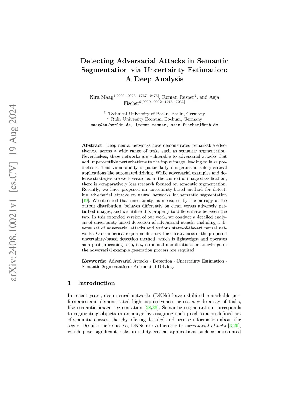 Deep neural networks have demonstrated remarkable effectiveness across a wide range of tasks such as semantic segmentation. Nevertheless, these networks are vulnerable to adversarial attacks that add imperceptible perturbations to the input image, leading to false predictions. This vulnerability is particularly dangerous in safety-critical applications like automated driving. While adversarial examples and defense strategies are well-researched in the context of image classification, there is comparatively less research focused on semantic segmentation. Recently, we have proposed an uncertainty-based method for detecting adversarial attacks on neural networks for semantic segmentation. We observed that uncertainty, as measured by the entropy of the output distribution, behaves differently on clean versus adversely perturbed images, and we utilize this property to differentiate between the two. In this extended version of our work, we conduct a detailed analysis of uncertainty-based detection of adversarial attacks including a diverse set of adversarial attacks and various state-of-the-art neural networks. Our numerical experiments show the effectiveness of the proposed uncertainty-based detection method, which is lightweight and operates as a post-processing step, i.e., no model modifications or knowledge of the adversarial example generation process are required.